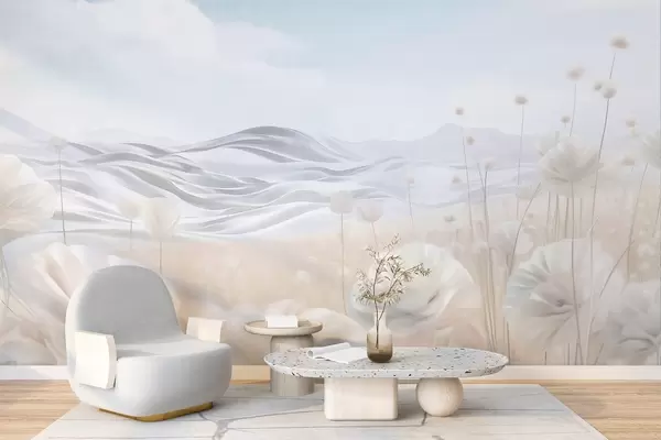 Fototapetai Tekstūruotas kreminių aguonų laukas su banguotais kalnais po šviesiai mėlynu dangumi su švelniais debesimis, pastelinės spalvos Nr. w09553