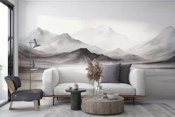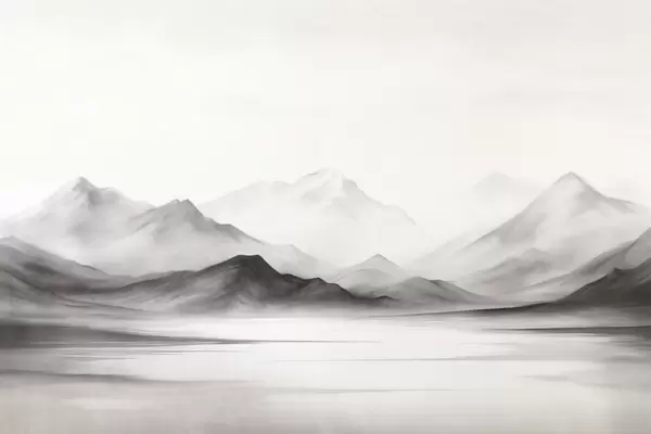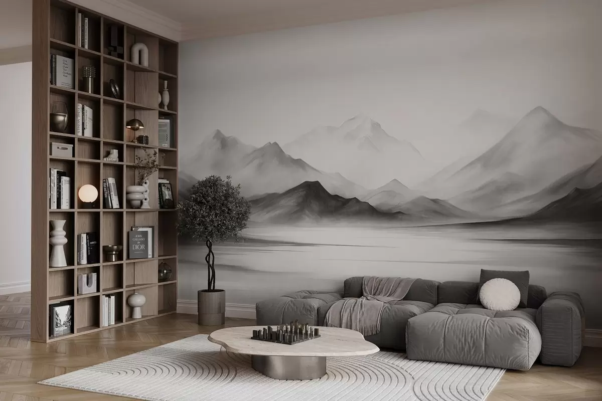 Fototapetai Vienaspalvis tekstūruotas peizažas su rūko apgaubtais kalnais ir ežeru priešakyje Nr. w09555