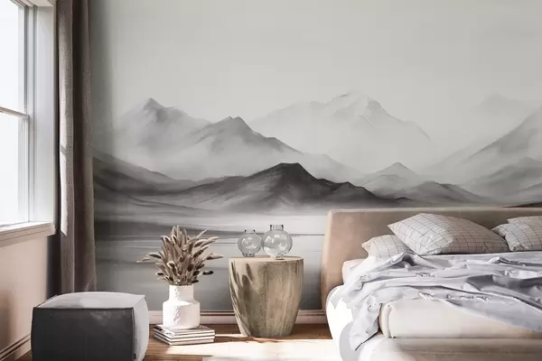 Fototapetai Vienaspalvis tekstūruotas peizažas su rūko apgaubtais kalnais ir ežeru priešakyje Nr. w09555