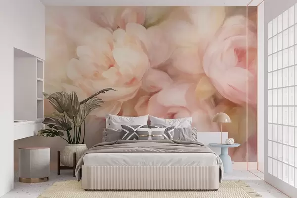 Fototapetai Neryškūs šviesiai rožiniai ir kreminiai bijūnai, imituojantys švelnius, tapybinius potėpius, sukuria tekstūrinį gėlių kompoziciją Nr. w09556