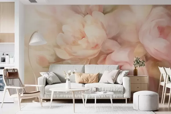 Fototapetai Neryškūs šviesiai rožiniai ir kreminiai bijūnai, imituojantys švelnius, tapybinius potėpius, sukuria tekstūrinį gėlių kompoziciją Nr. w09556