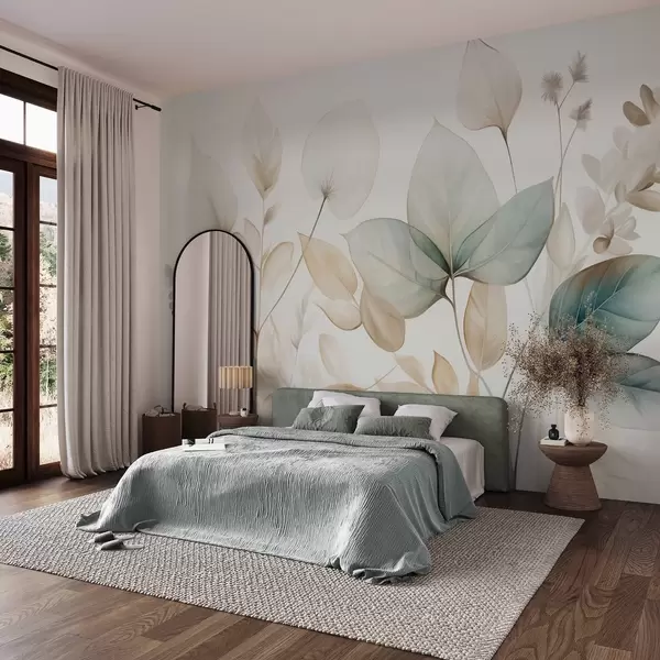 Fototapetai Tekstūruoti permatomi lapai švelnių smėlio ir žalios spalvos atspalvių, su subtiliais stiebais ant švelnaus, šviesaus fono Nr. w09583