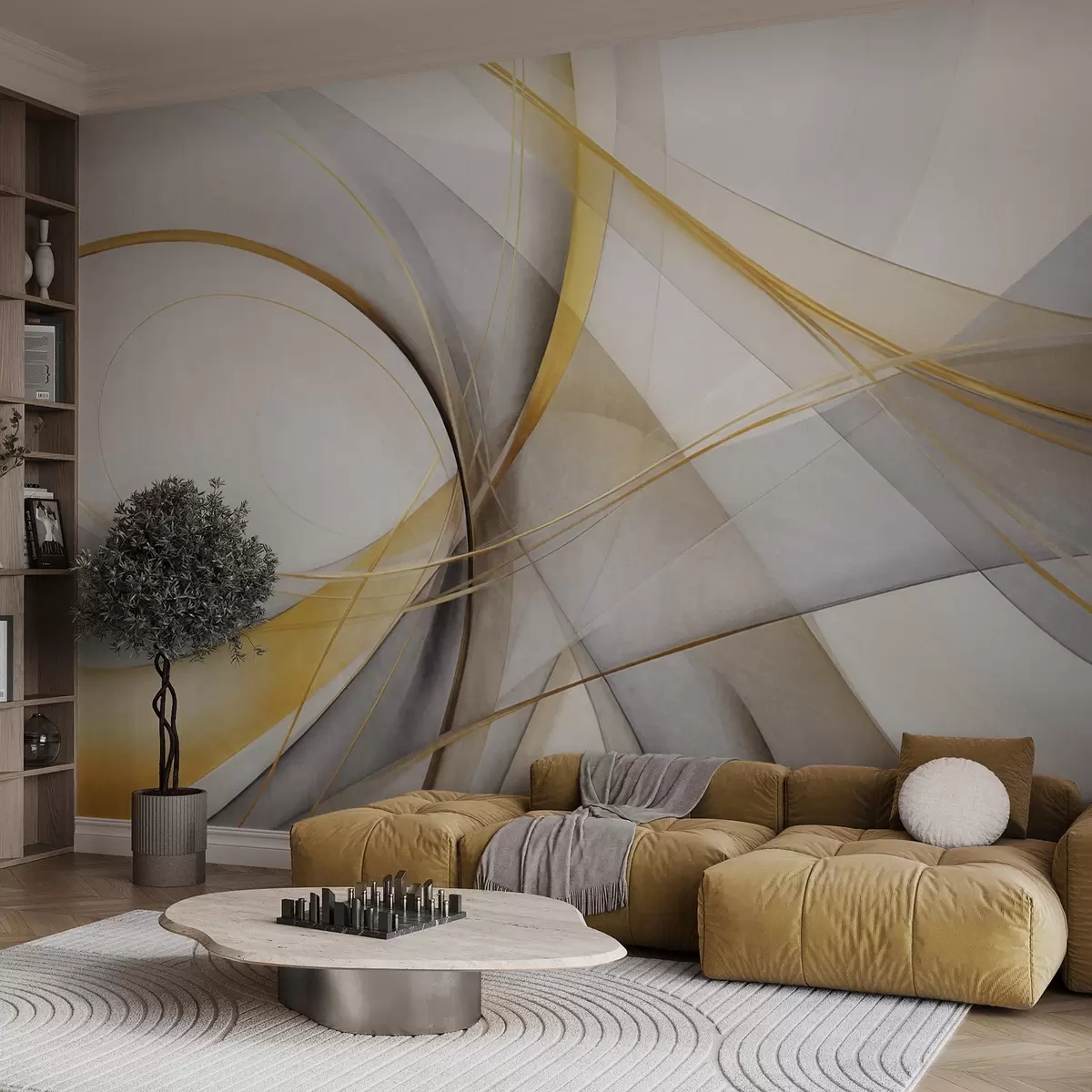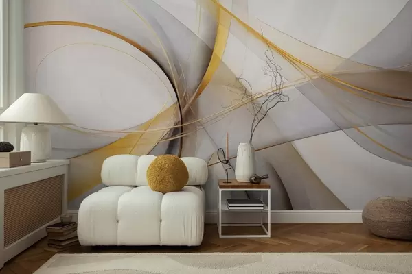 Fototapetai Abstrakčios tekančios linijos geltonos ir baltos spalvos ant pilko fono, su judėjimo ir gylio pojūčiu, modernus menas Nr. w09587