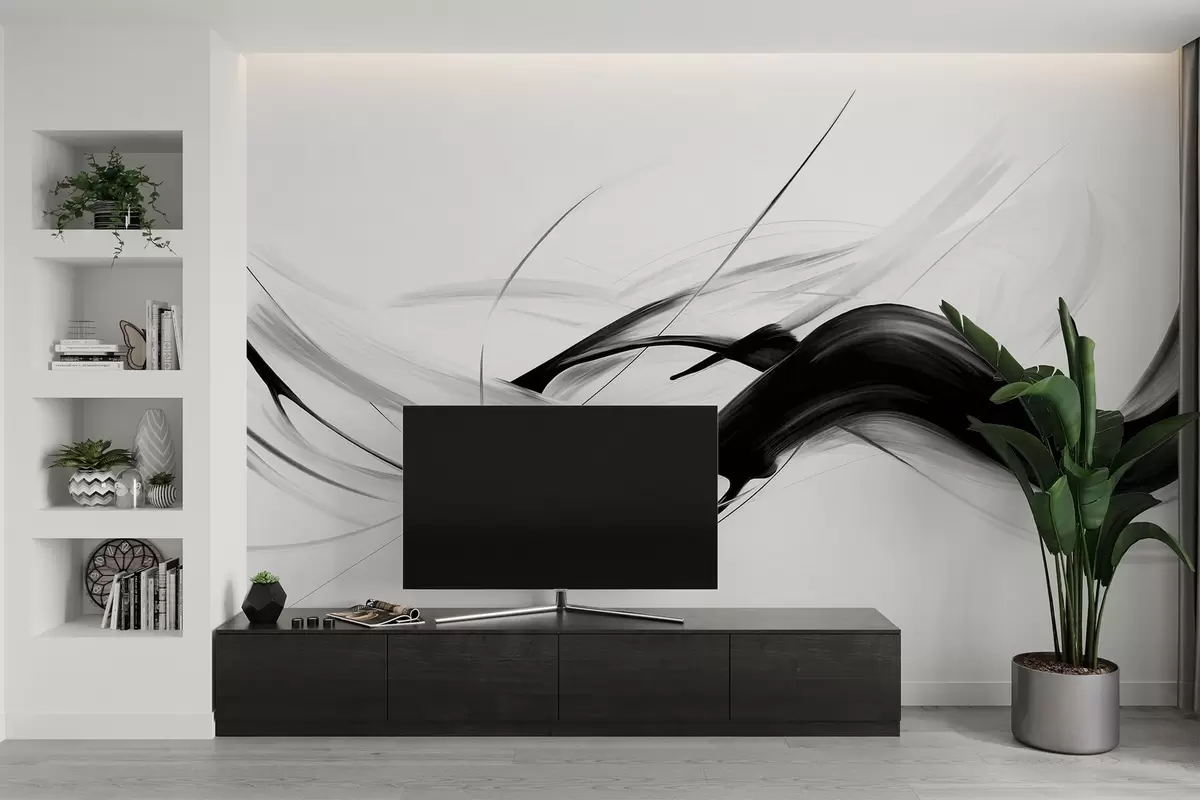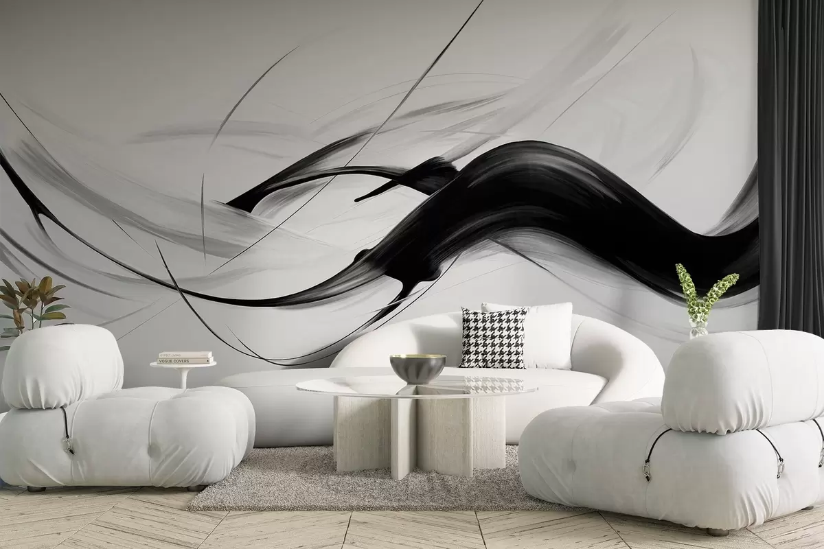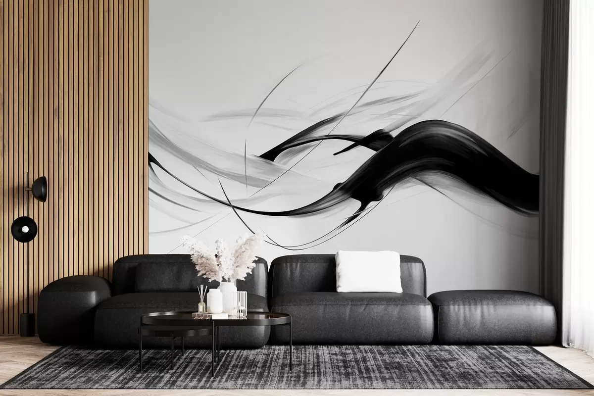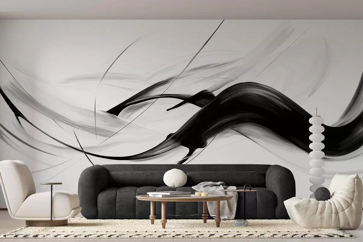 Fototapetai Abstrakčios juodos ir baltos spalvos potėpiai su plonomis linijomis, sudarančios modernų dizainą šviesaus fono fone. Nr. w09605
