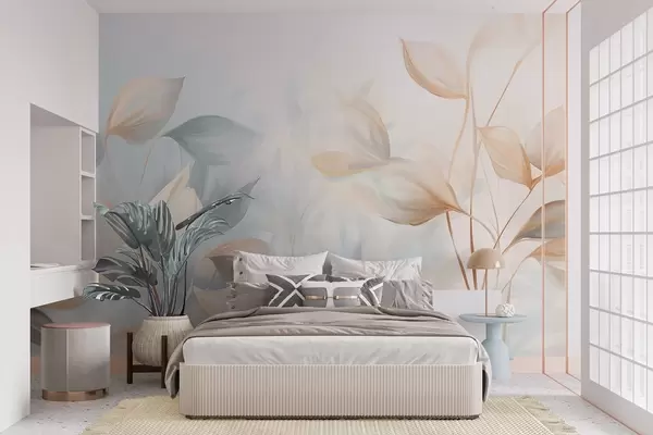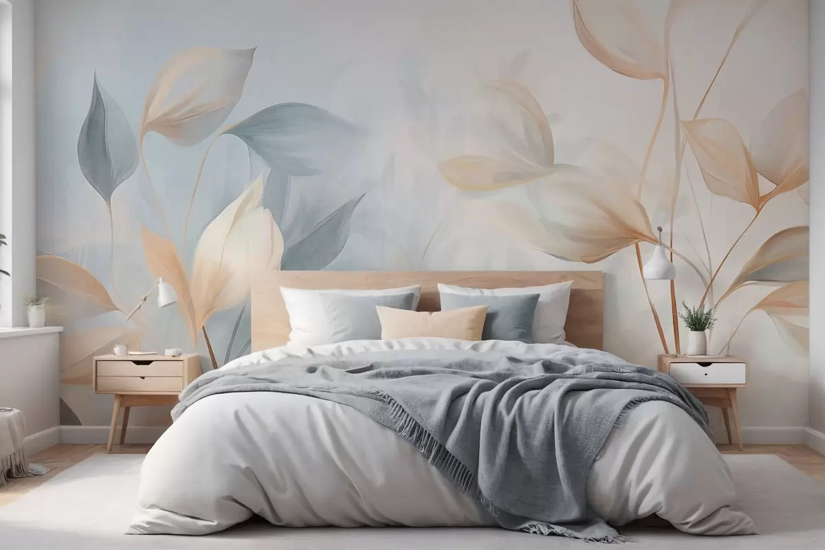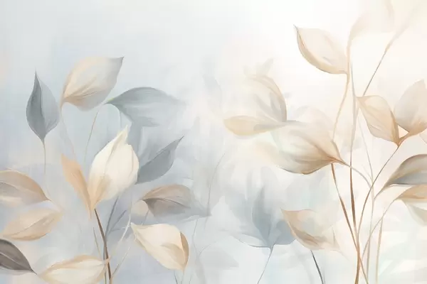 Fototapetai Minkštos, subtilios, permatomos lapų tekstūros, atspalviai – švelnus smėlio, persiko ir šviesiai mėlynas, tekstūruotas pastelinis menas. Nr. w09607