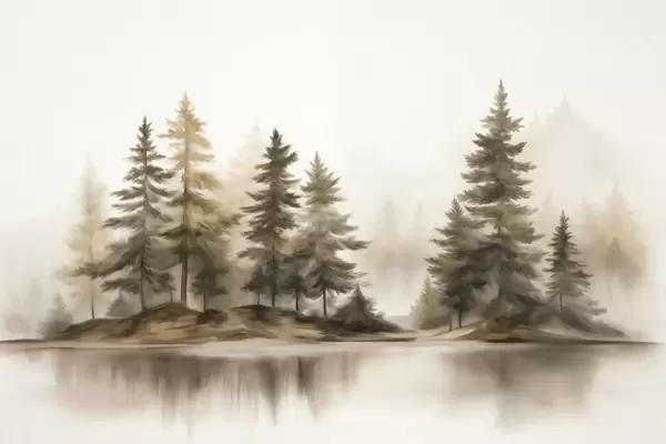 Fototapetai Tekstūruotas rūko apgaubtas miškas su aukštomis pušimis, tapybos imitacija Nr. w09610