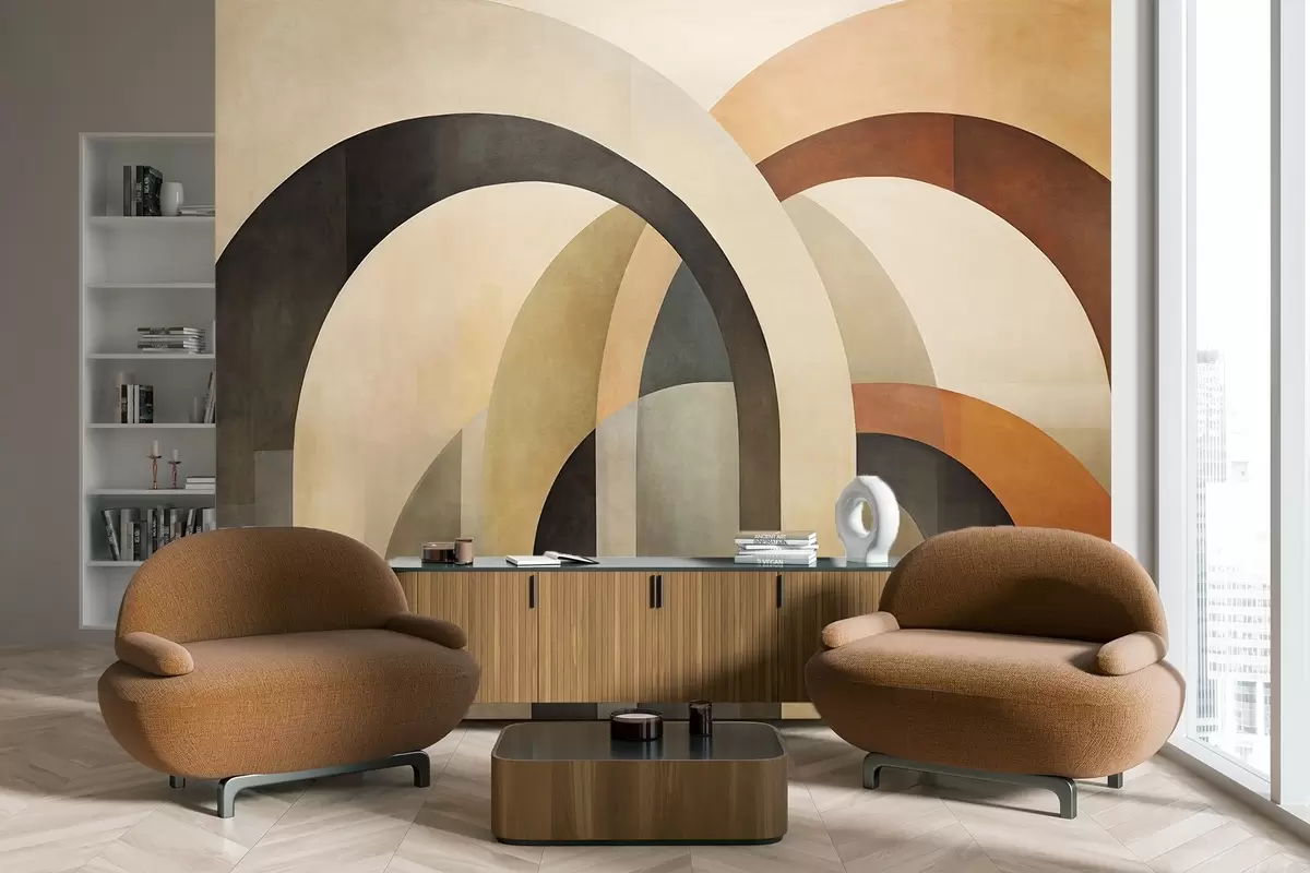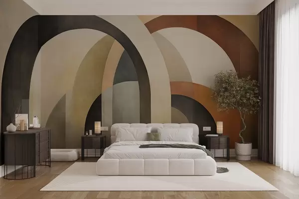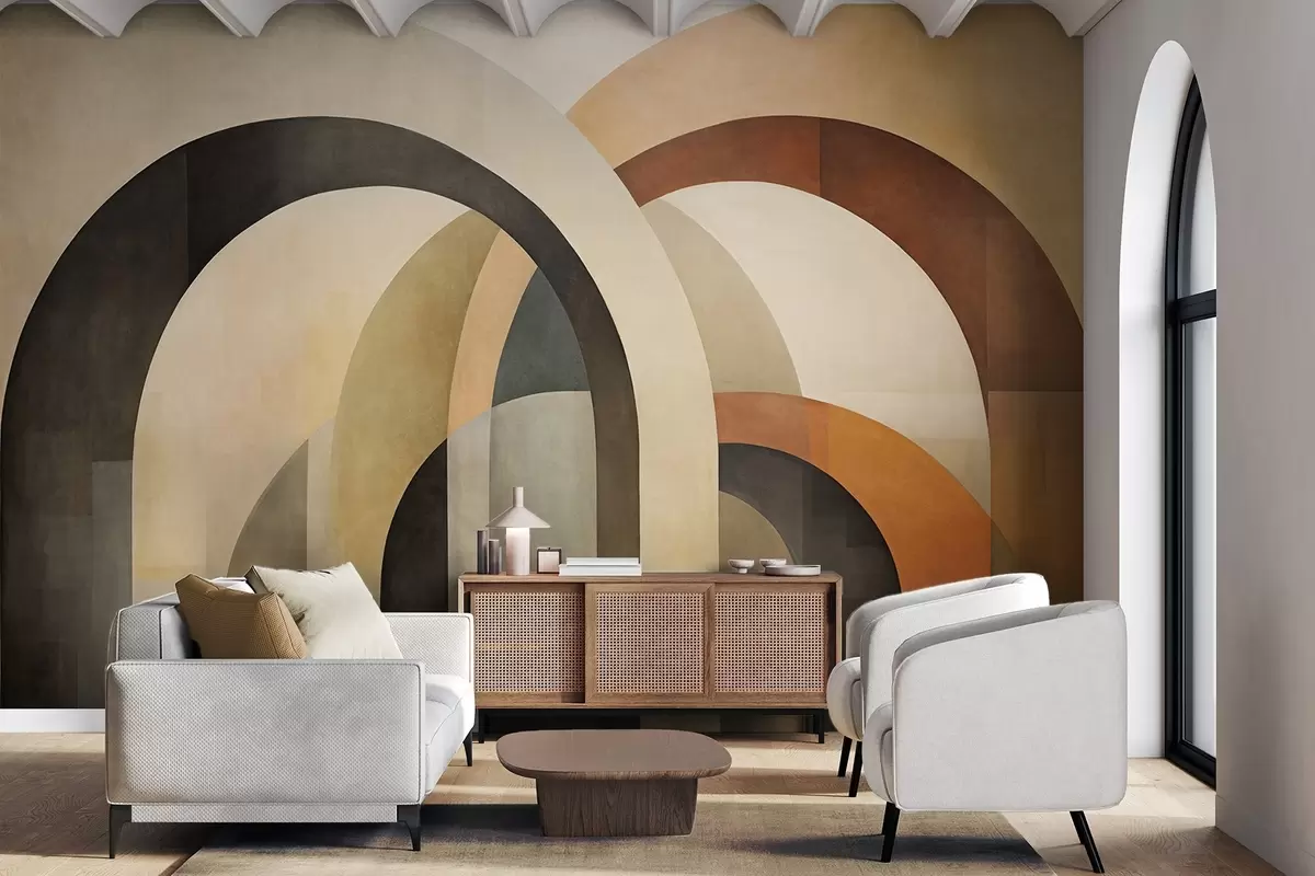 Fototapetai Abstrakčios tekstūruotos geometrinės arkos žemės atspalvių – smėlio, rudos ir pilkos spalvų, daugiasluoksnis modernus architektūrinis dizainas. Nr. w09611