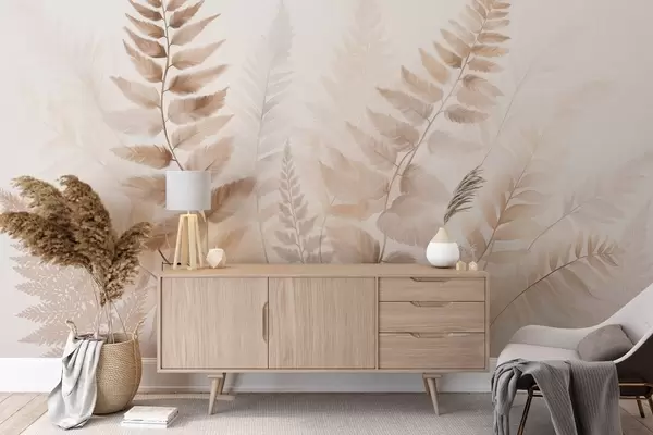 Fototapetai Tekstūruoti džiovinti paparčių lapai įvairių rudų atspalvių, su švelniu, šviesiu fonu akvarelės stiliumi. Nr. w09615