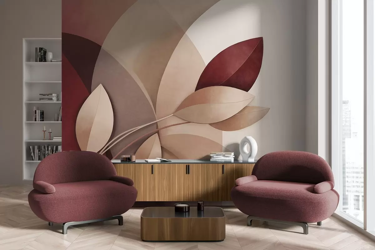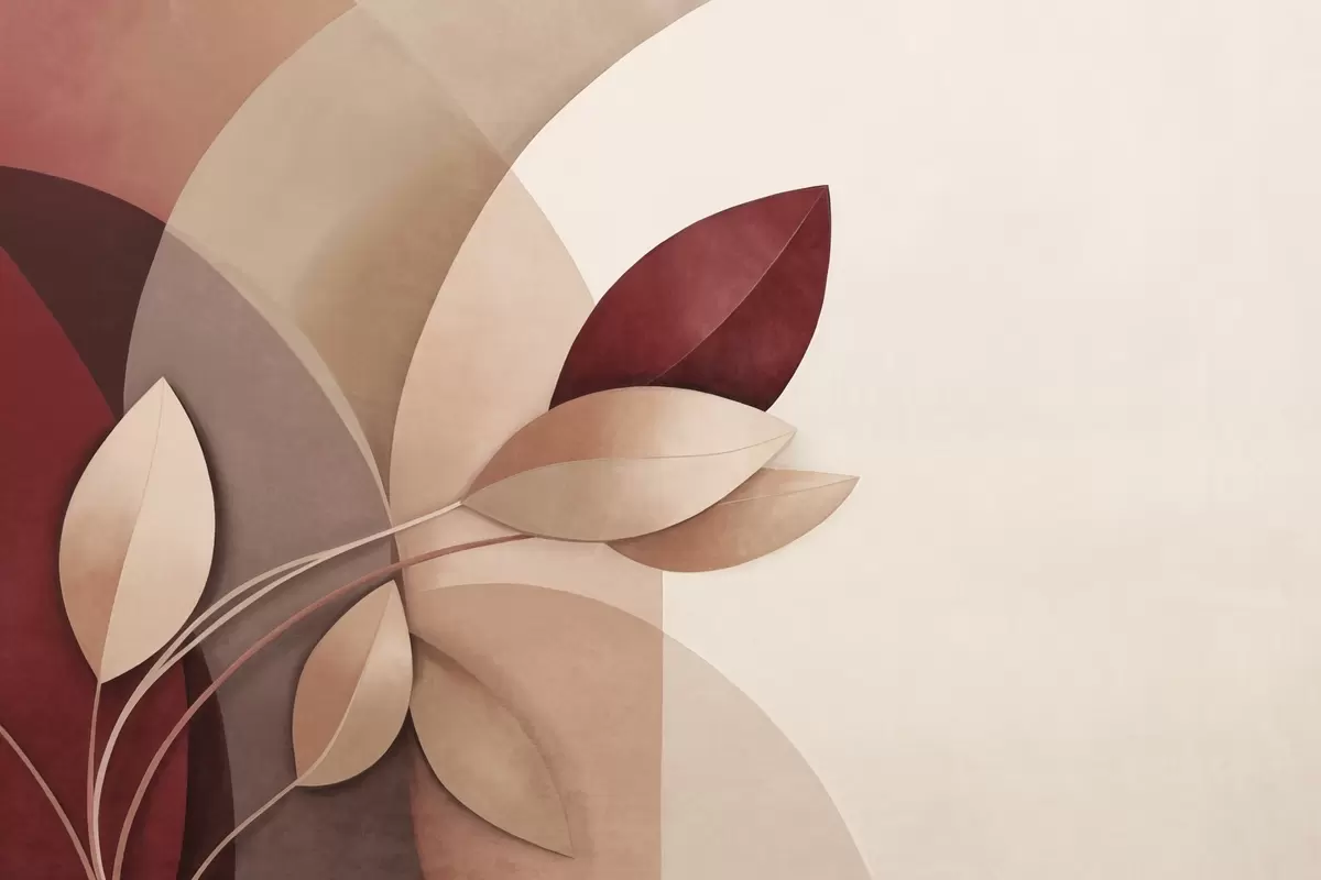 Fototapetai Abstraktaus tekstūros šaka su rudų, smėlio ir raudonų atspalvių lapais, abstrakčių formų fone Nr. w09618