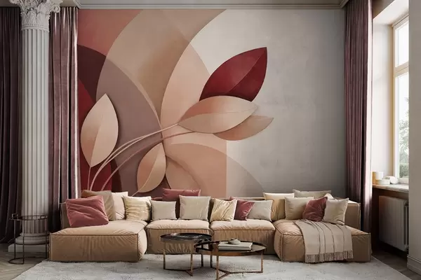 Fototapetai Abstraktaus tekstūros šaka su rudų, smėlio ir raudonų atspalvių lapais, abstrakčių formų fone Nr. w09618