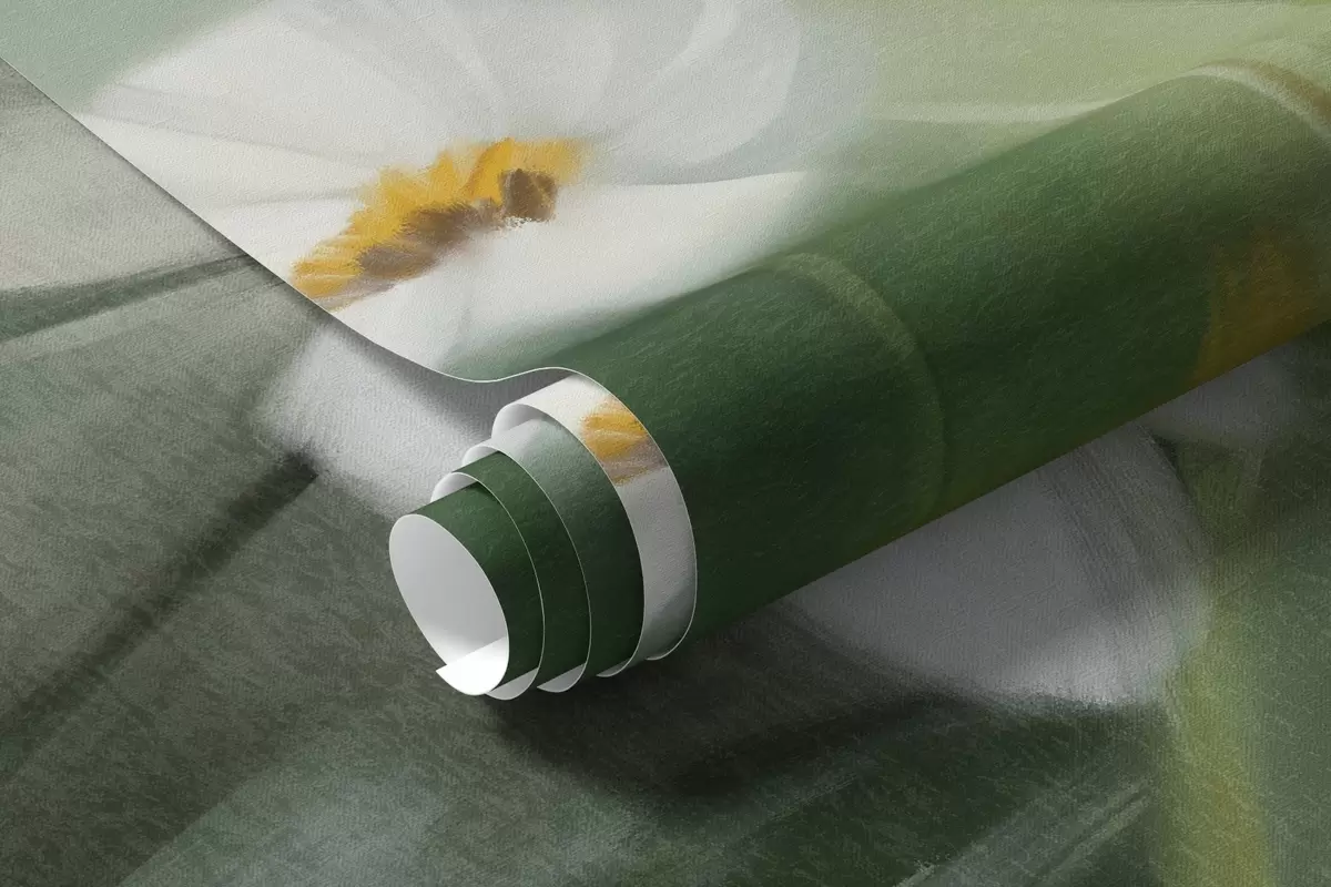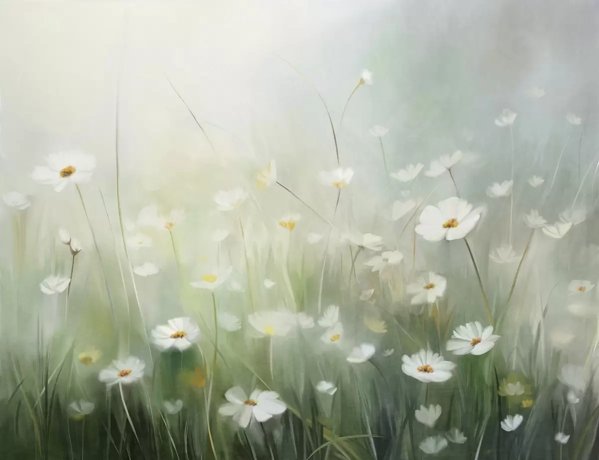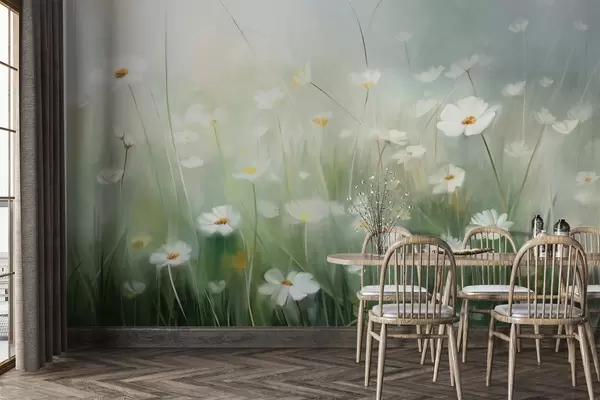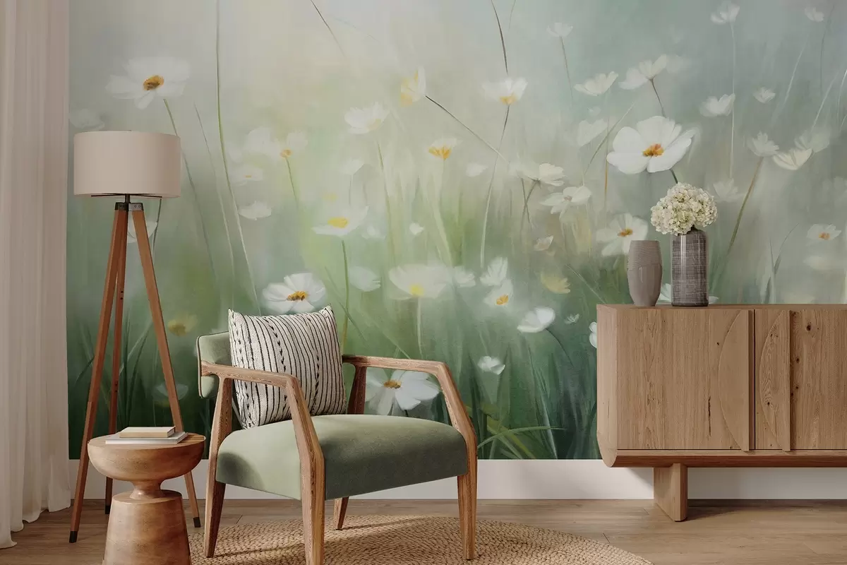 Fototapetai Abstraktus baltų saulėgrąžų laukas su žalia žole ir švelniu, miglotu fonu tapybos stiliumi Nr. w09619