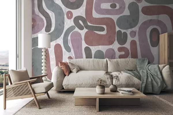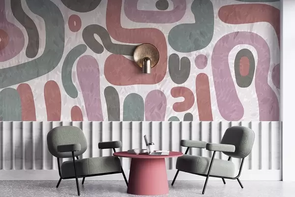 Fototapetai Abstrakčios tekstūruotos formos prislopintų rožinių, žalių ir pilkų atspalvių, ant tekstūruoto fono, šiuolaikinis menas Nr. w09622