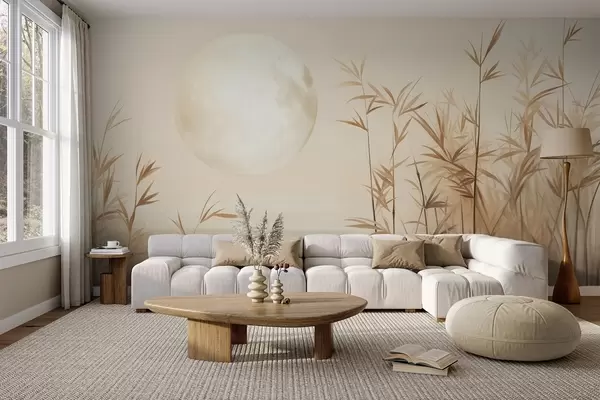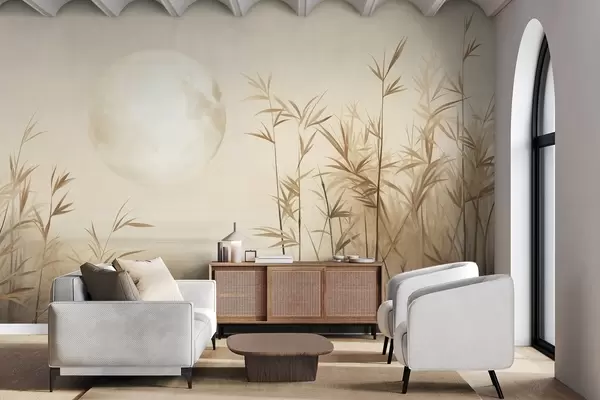 Fototapetai Tekstūruotas kraštovaizdis su aukštais nendrėmis, ežeru ir blyškiu mėnesiu miglotame danguje Nr. w09631