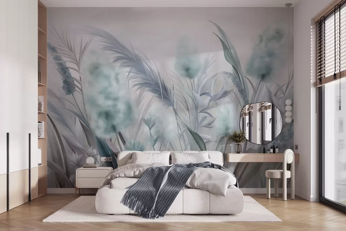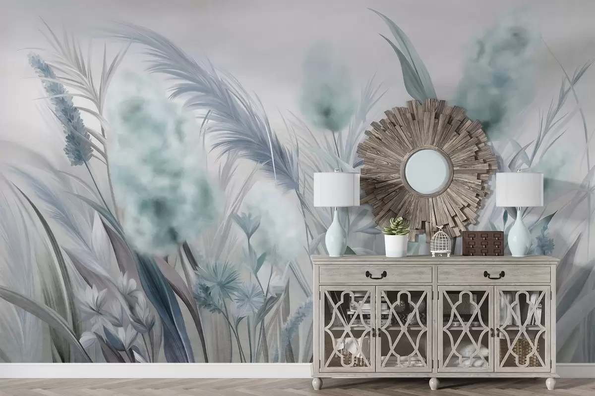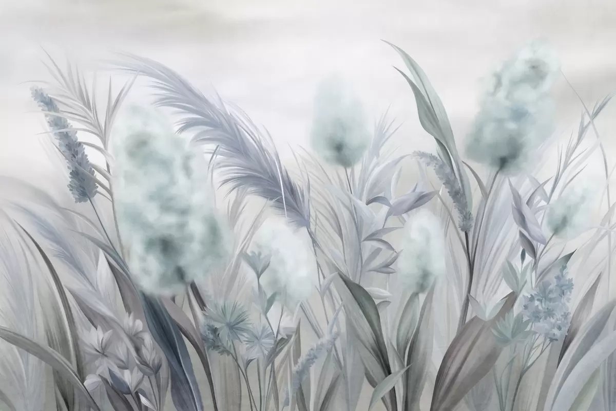 Fototapetai Mėlyna ir pilka pampų žolė ir kitos džiovintos gėlės su švelniu, miglotu dangumi fone Nr. w09635v1