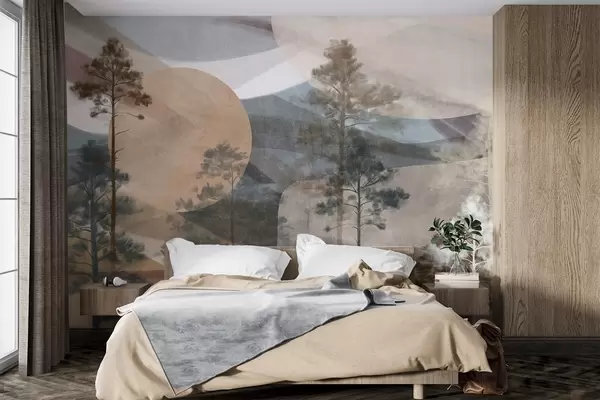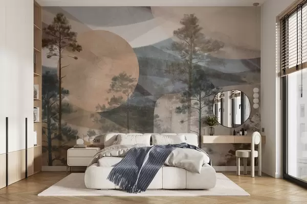 Fototapetai Aukštos pušys niūriame tekstūrinio reljefo kraštovaizdyje su abstrakčiomis apvaliomis formomis ir sluoksniuotomis kalnų viršūnėmis žemės atspalvių tonais. Nr. w09636