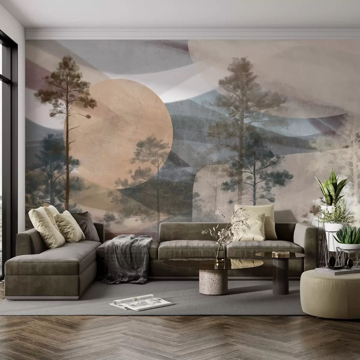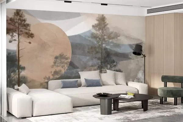 Fototapetai Aukštos pušys niūriame tekstūrinio reljefo kraštovaizdyje su abstrakčiomis apvaliomis formomis ir sluoksniuotomis kalnų viršūnėmis žemės atspalvių tonais. Nr. w09636