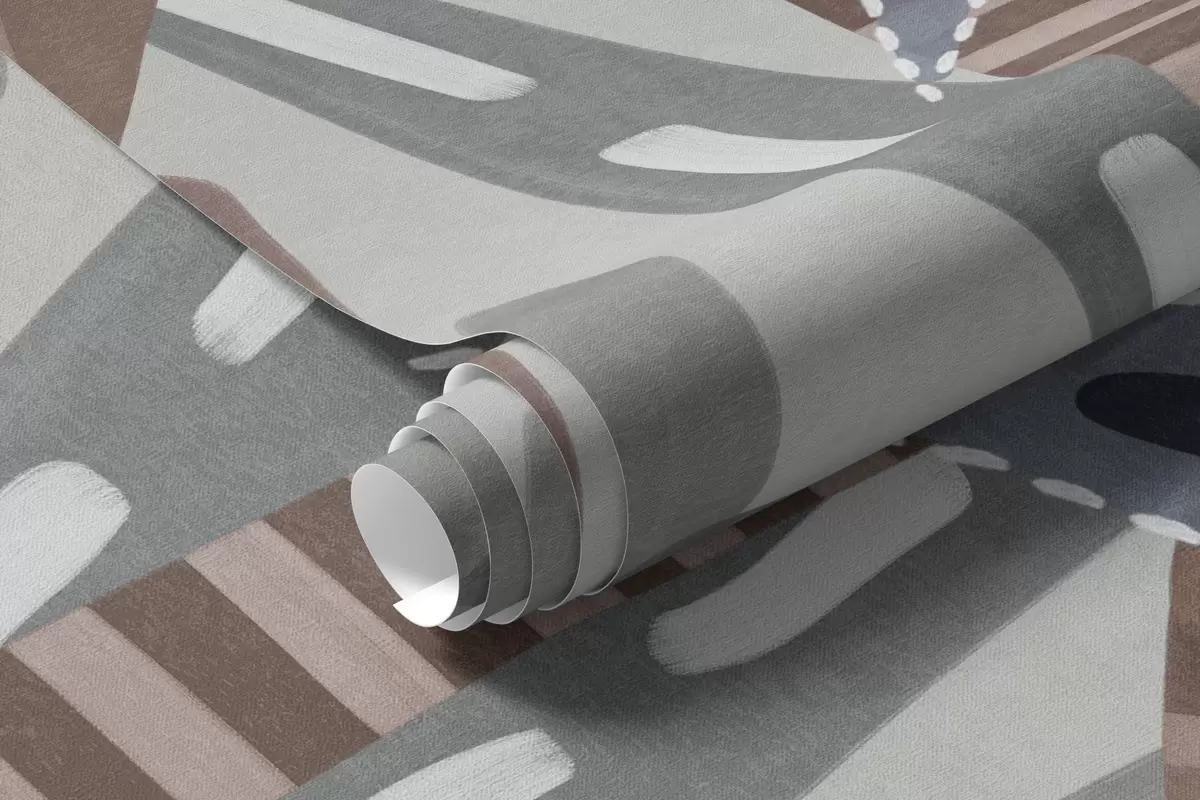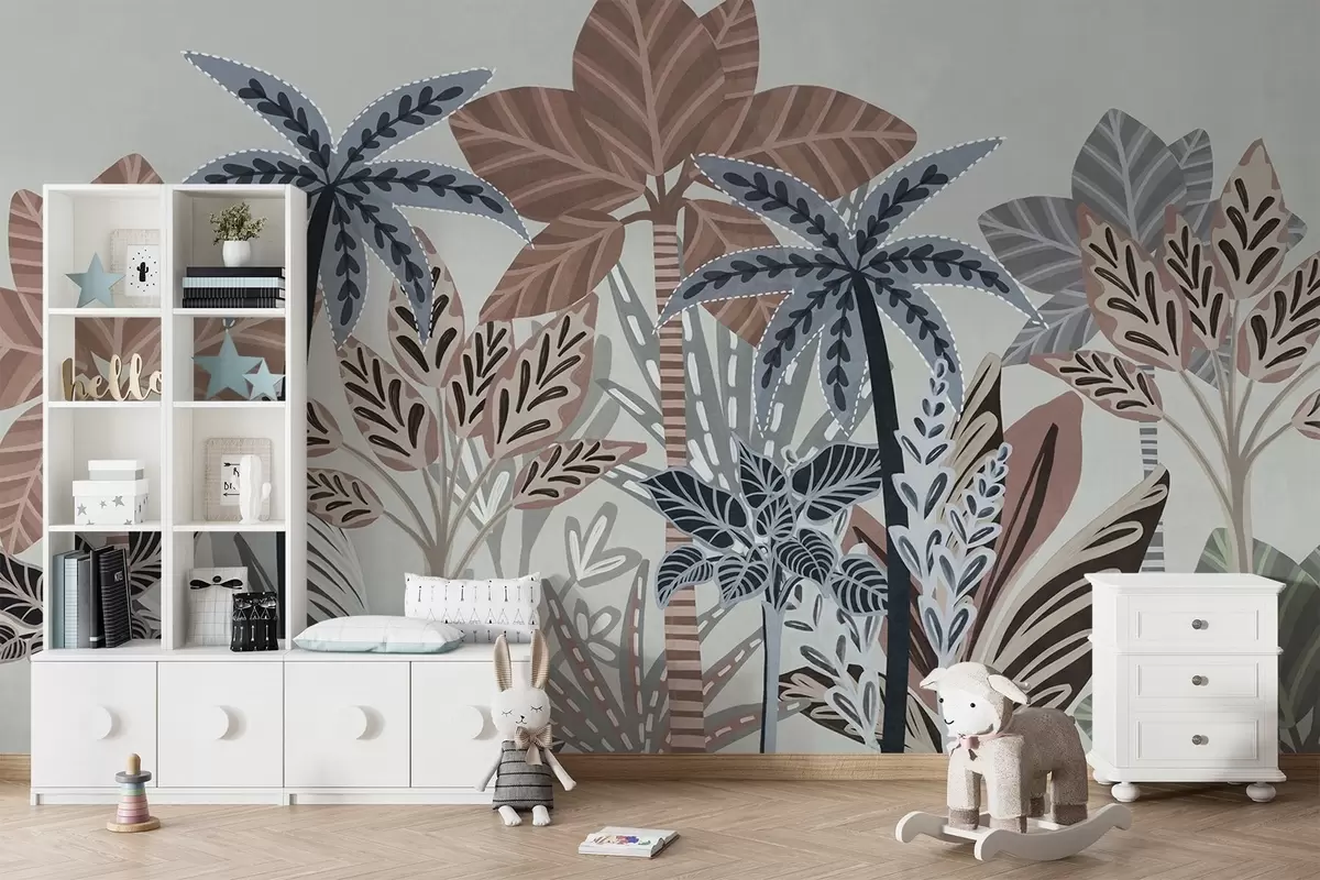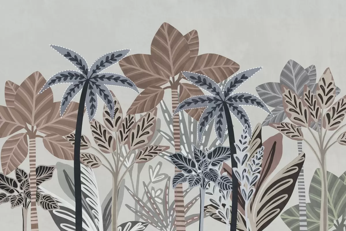 Fototapetai Tekstūruoti tropiniai augalai ir palmių medžiai su prislopintomis spalvomis dekoratyviame boho stiliuje ant pilko fono Nr. w09639v1