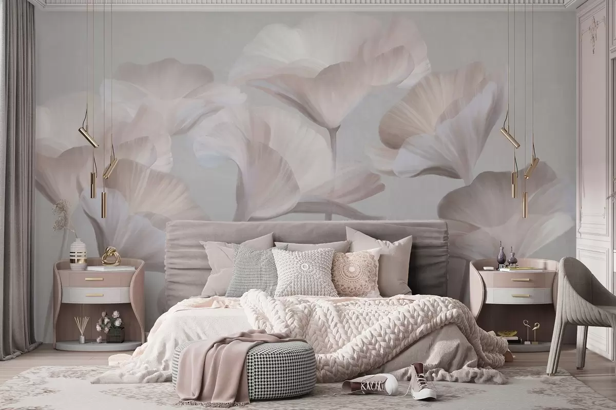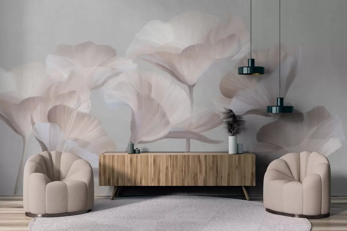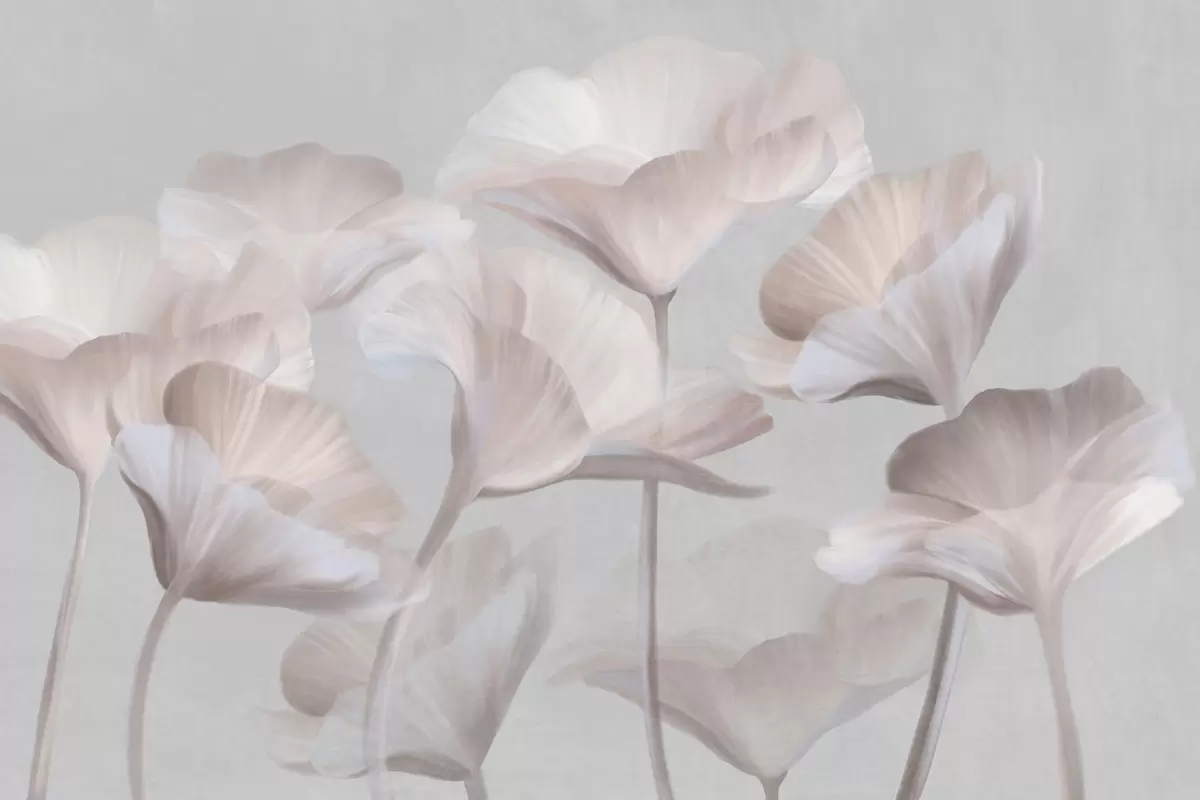 Fototapetai Šviesiai persikų spalvos tekstūruotos permatomos lotoso gėlės su subtiliais žiedlapiais ant prislopinto pilko fono Nr. w09640
