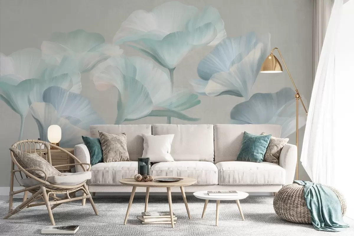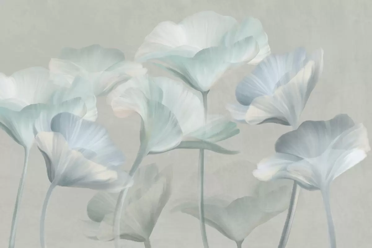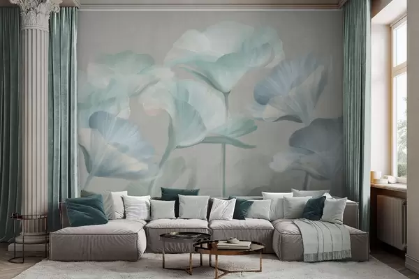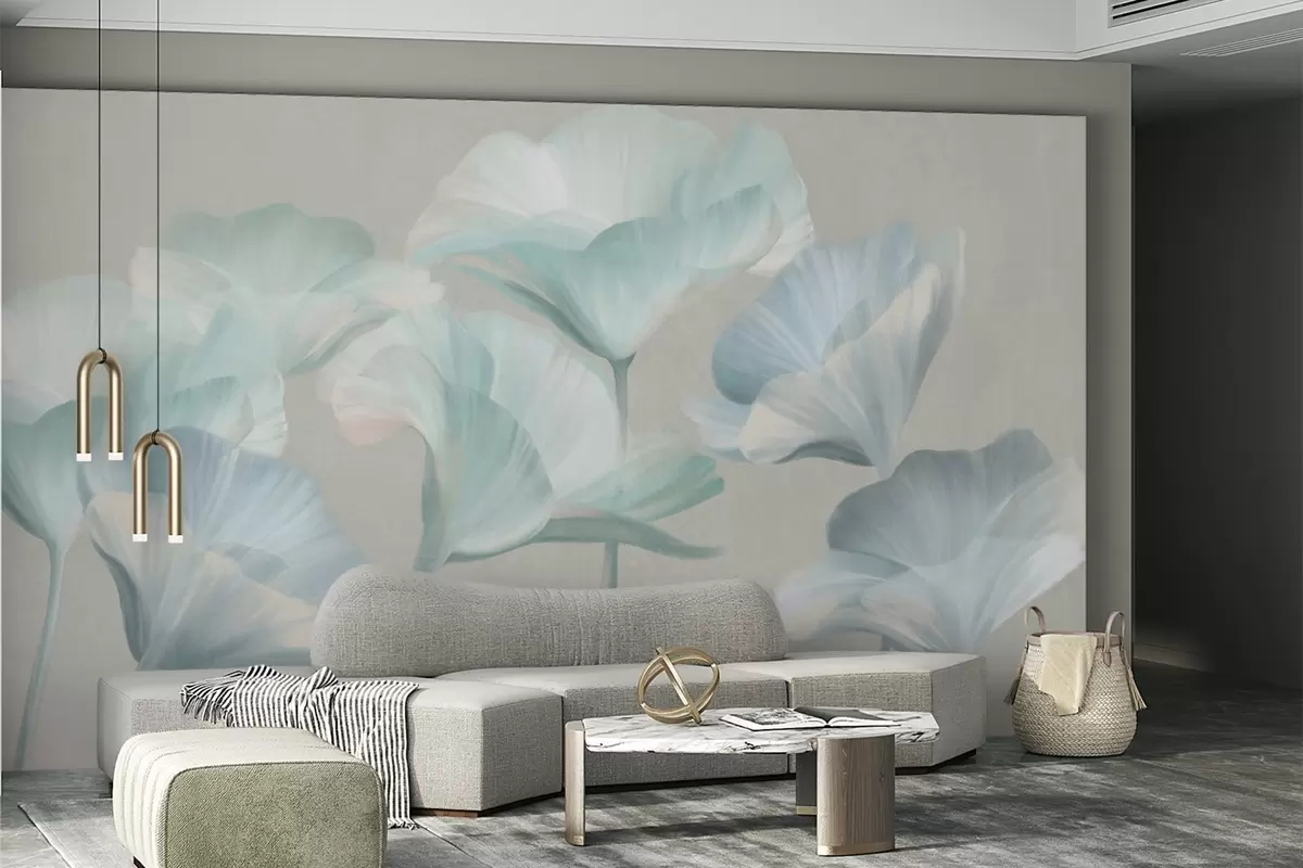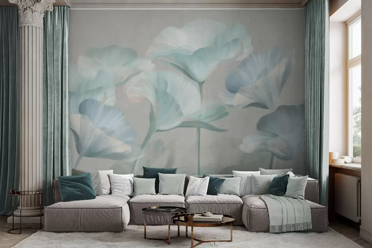 Fototapetai Šviesiai turkio spalvos tekstūruotos permatomos lotoso gėlės su subtiliais žiedlapiais ant prislopinto pilko fono Nr. w09640v2