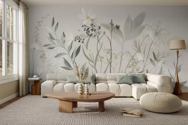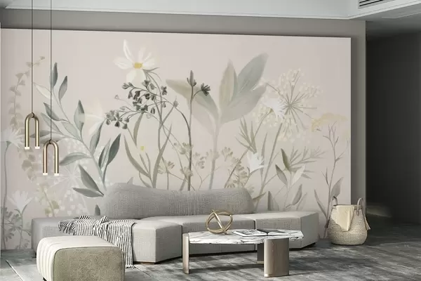 Fototapetai Subtilaus tekstūros laukinės gėlės ir lapai prislopintų žalios ir kreminės spalvų tonų ant švelnaus smėlio spalvos fono Nr. w09641