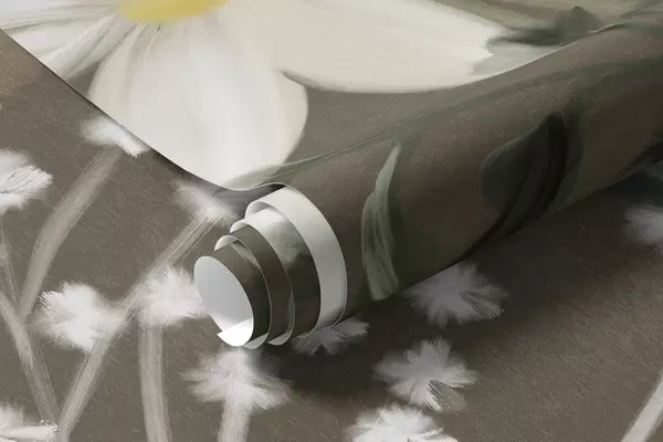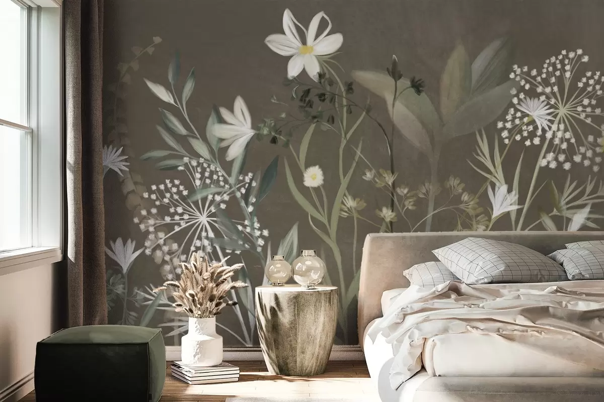 Fototapetai Subtilaus tekstūros laukinės gėlės ir lapai prislopintų žalios ir kreminės spalvų tonų ant rudo fono Nr. w09641v1