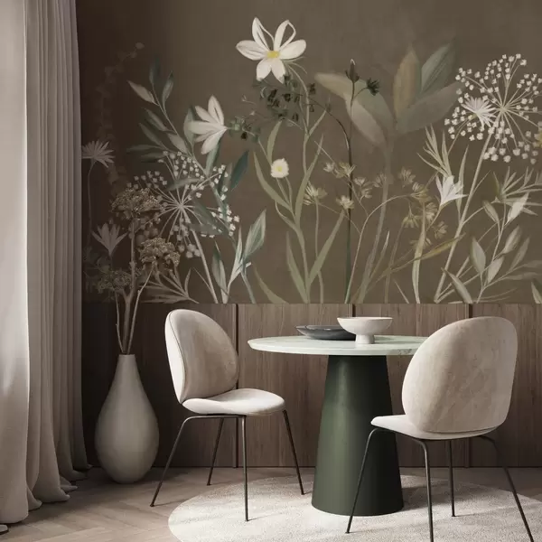Fototapetai Subtilaus tekstūros laukinės gėlės ir lapai prislopintų žalios ir kreminės spalvų tonų ant rudo fono Nr. w09641v1