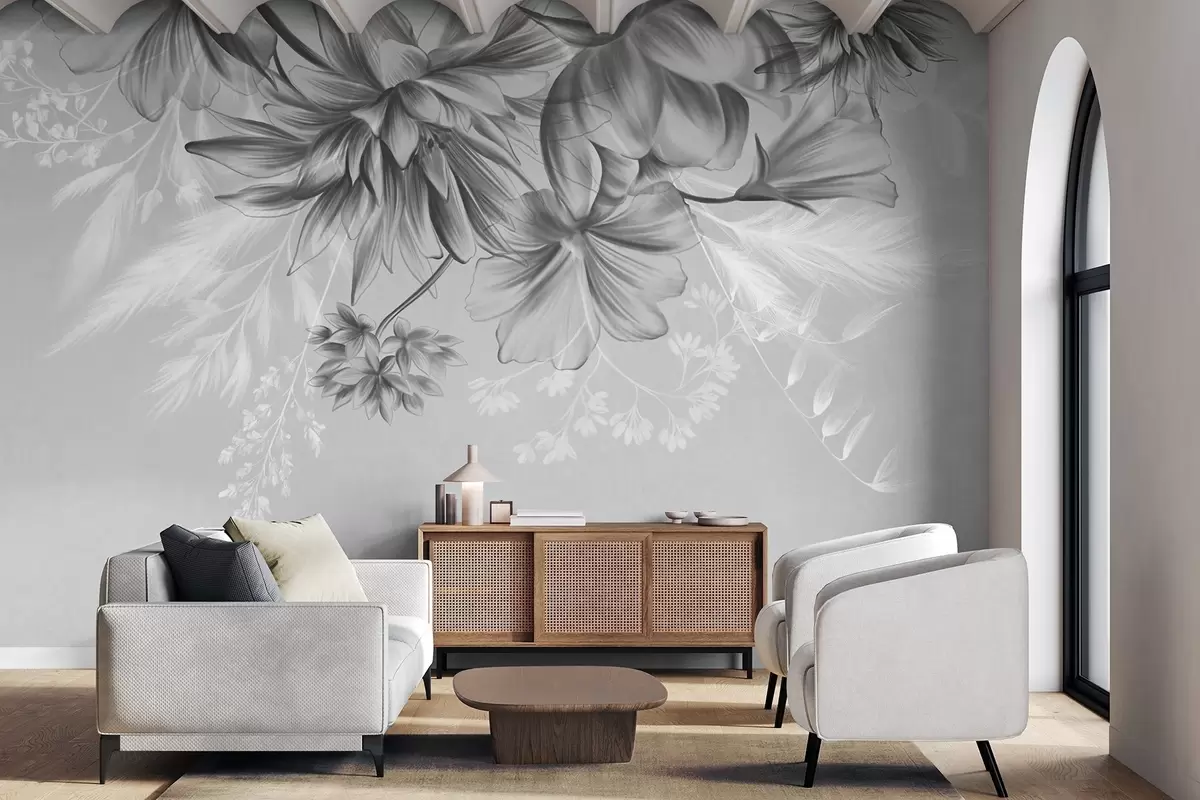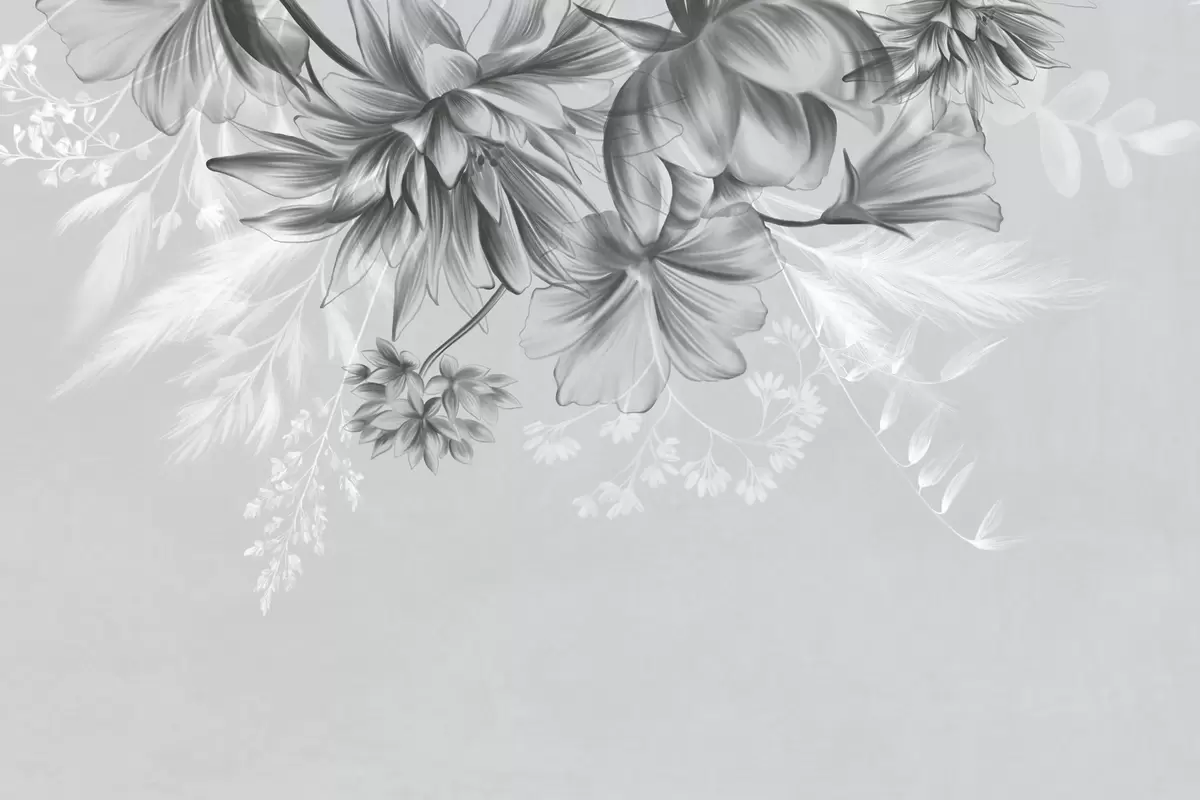 Fototapetai Tekstūruotos gėlės ir paparčiai tamsiai pilkos ir baltos spalvų atspalviais ant prislopinto pilko fono piešimo stilius Nr. w09644v1