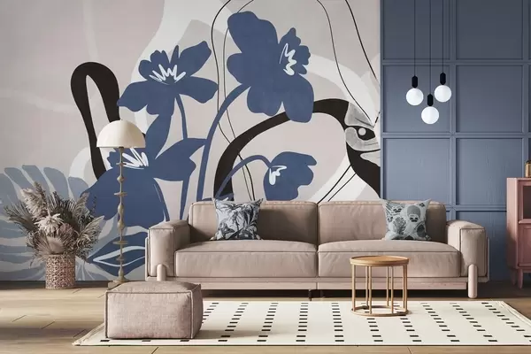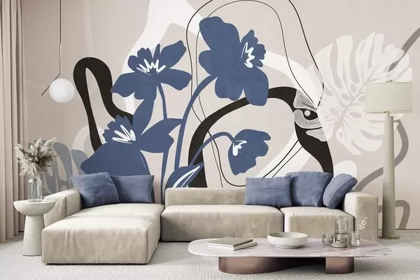 Fototapetai Abstrakčios tekstūruotos mėlynos gėlės su baltomis ir juodomis figūromis ant šviesiai smėlio spalvos fono, minimalistinis menas Nr. w09645