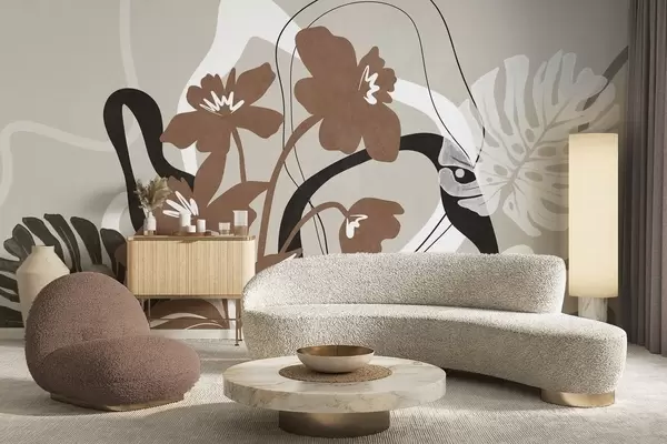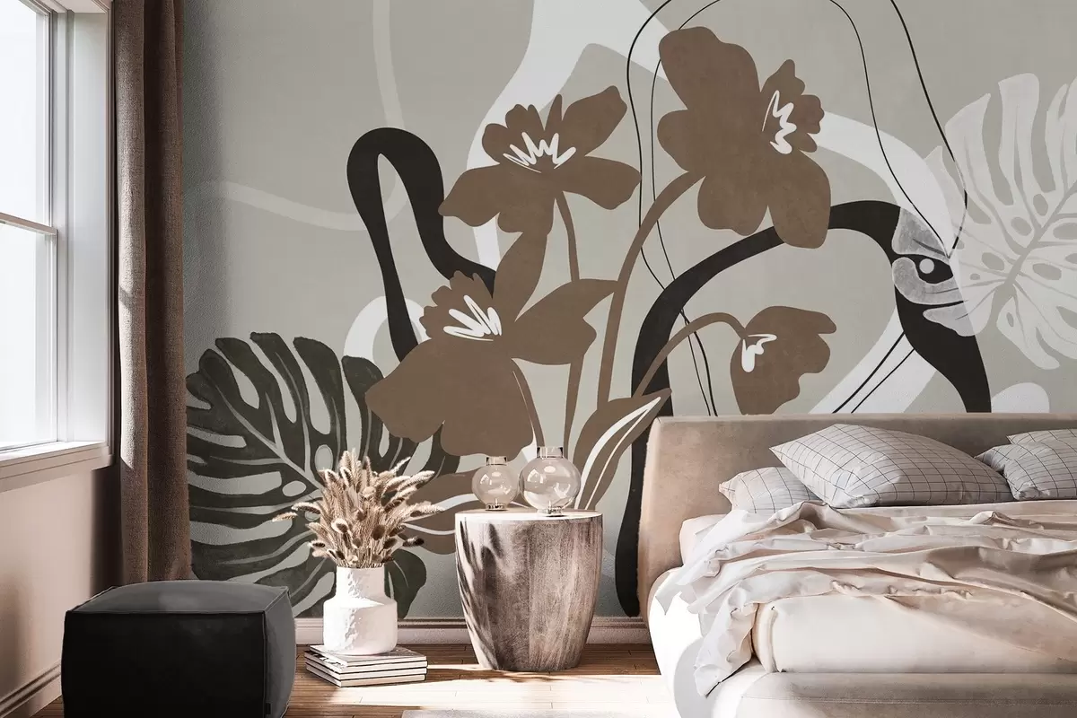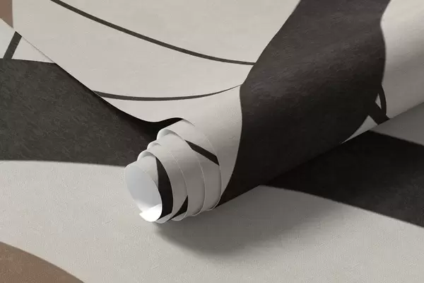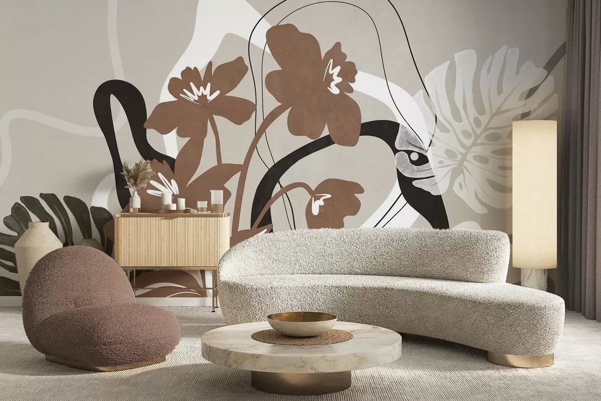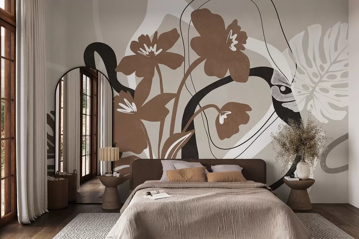 Fototapetai Abstrakčios tekstūros rudos gėlės su baltomis ir juodomis figūromis ant smėlio spalvos fono, minimalistinis menas Nr. w09645v1
