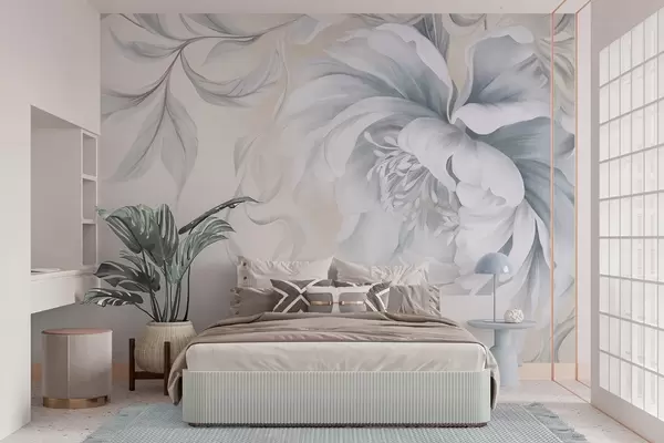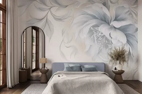 Fototapetai Didelė, reljefinė bijūnė su švelniais žiedlapiais ir pilkais lapais, nutapyta švelniu stiliumi Nr. w09647