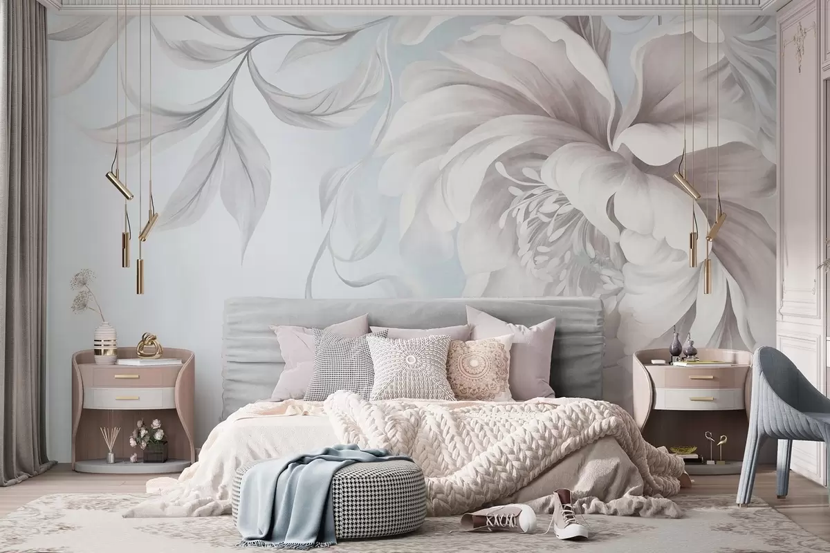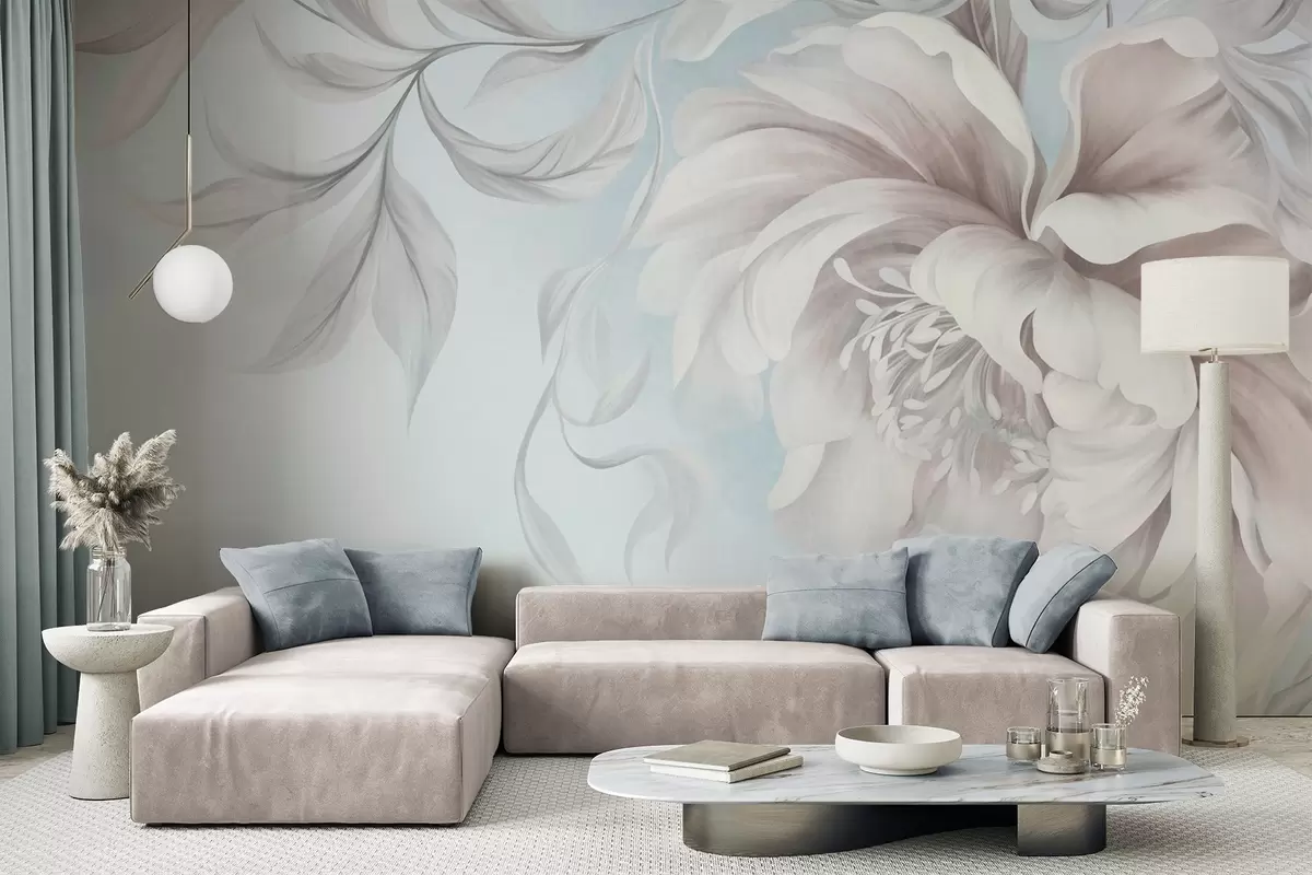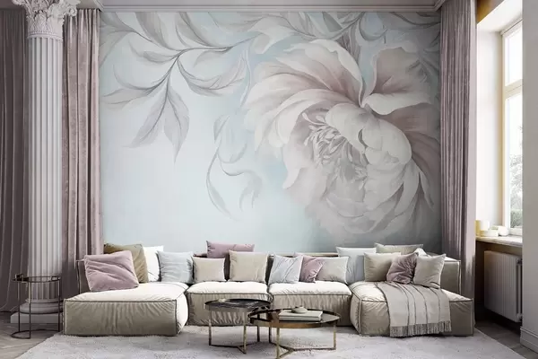 Fototapetai Didelė, reljefinė bijūnė su švelniais žiedlapiais ir pilkais lapais, nutapyta švelniu stiliumi Nr. w09647v1