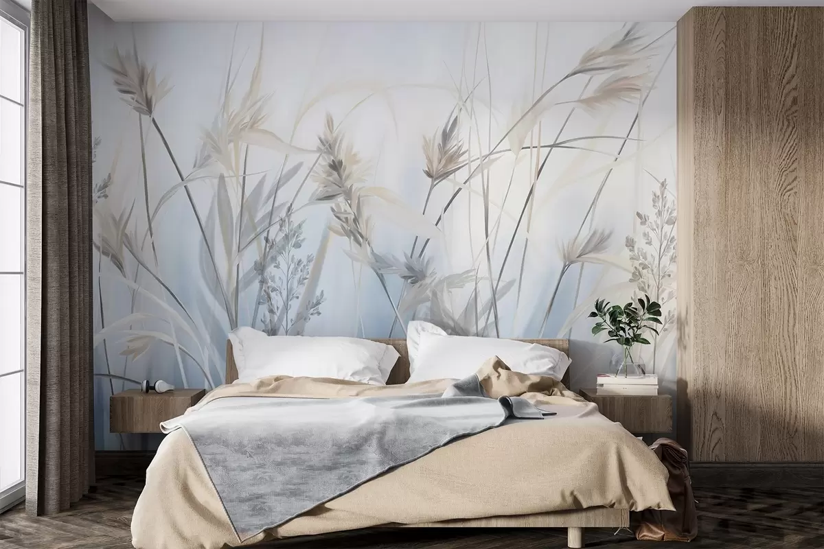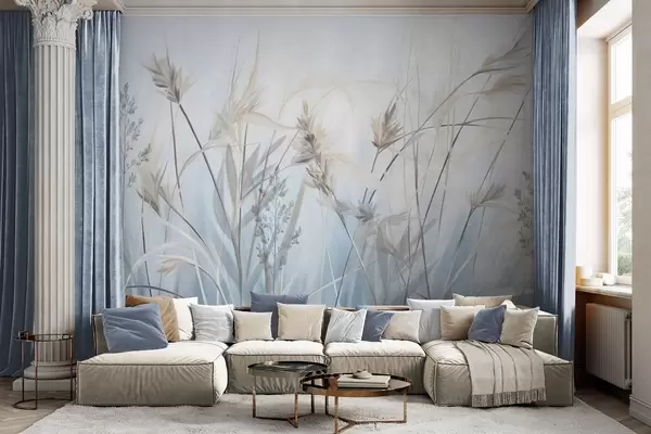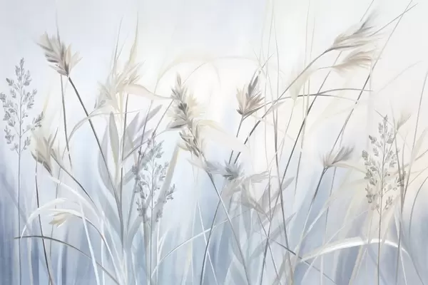Fototapetai Aukšti, sausi žolės stiebai su plunksniškais viršūniais, neryškiais atspalviais, minkštu, miglotu mėlynu ir baltu fonu. Nr. w09652