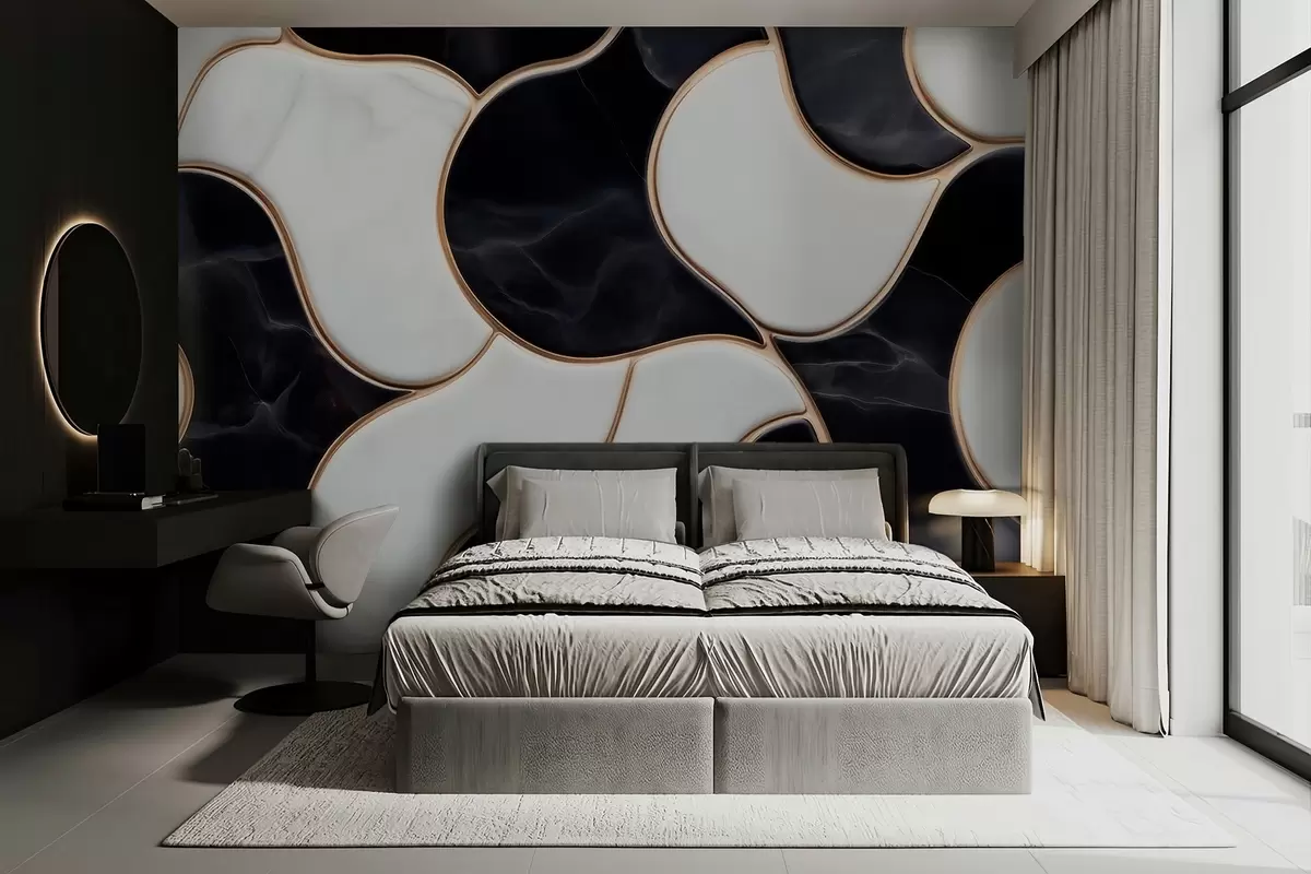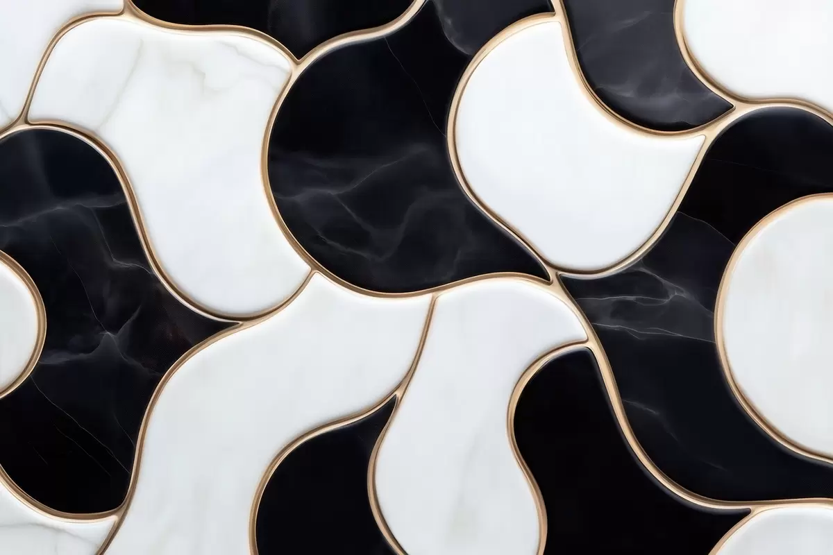 Fototapetai Abstrakti marmuro kompozicijos imitacija juodos ir baltos spalvų tonais su geltonomis linijomis Nr. w09733