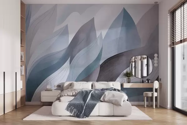 Fototapetai Abstrakčios lapų formos, prislopinti mėlynos žemės atspalviai su subtiliais linijų detalėmis, švelni akvarelės tekstūra. Nr. w09736v1