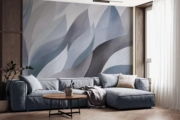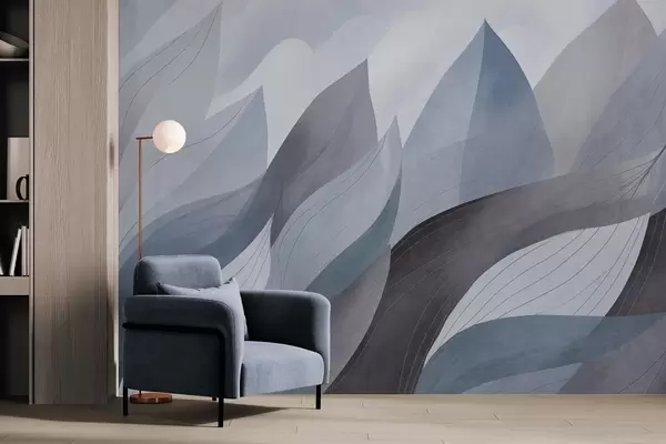Fototapetai Abstrakčios lapų formos, prislopinti mėlynos žemės atspalviai su subtiliais linijų detalėmis, švelni akvarelės tekstūra. Nr. w09736v1