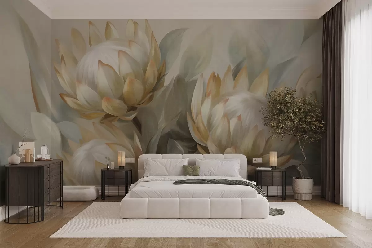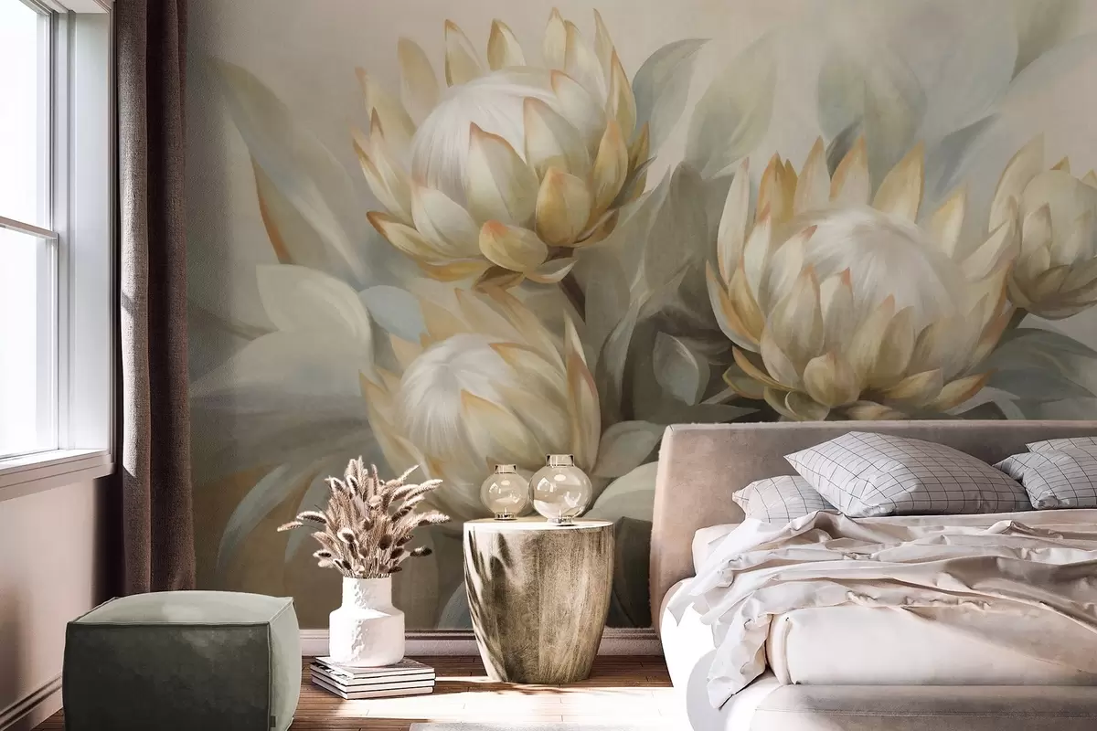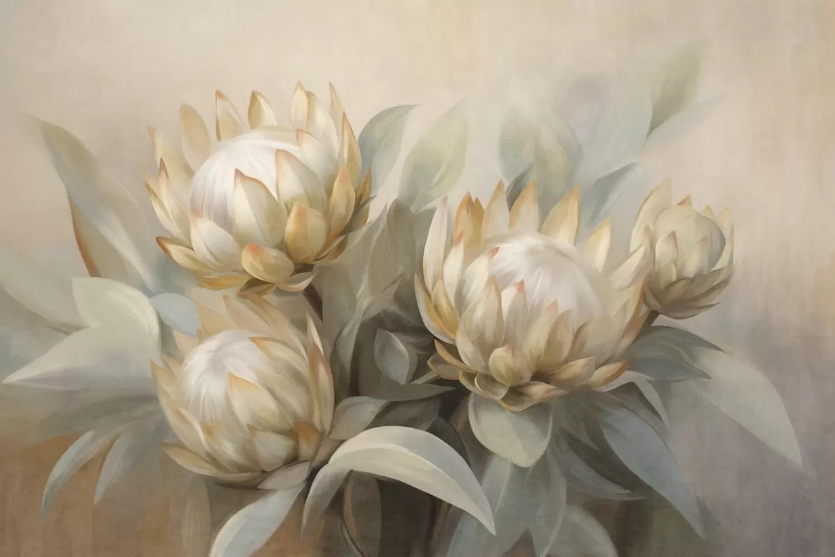 Fototapetai Tekstūruotos proteos gėlės su žaliais lapais ir minkštu, neryškiu fonu Nr. w09738