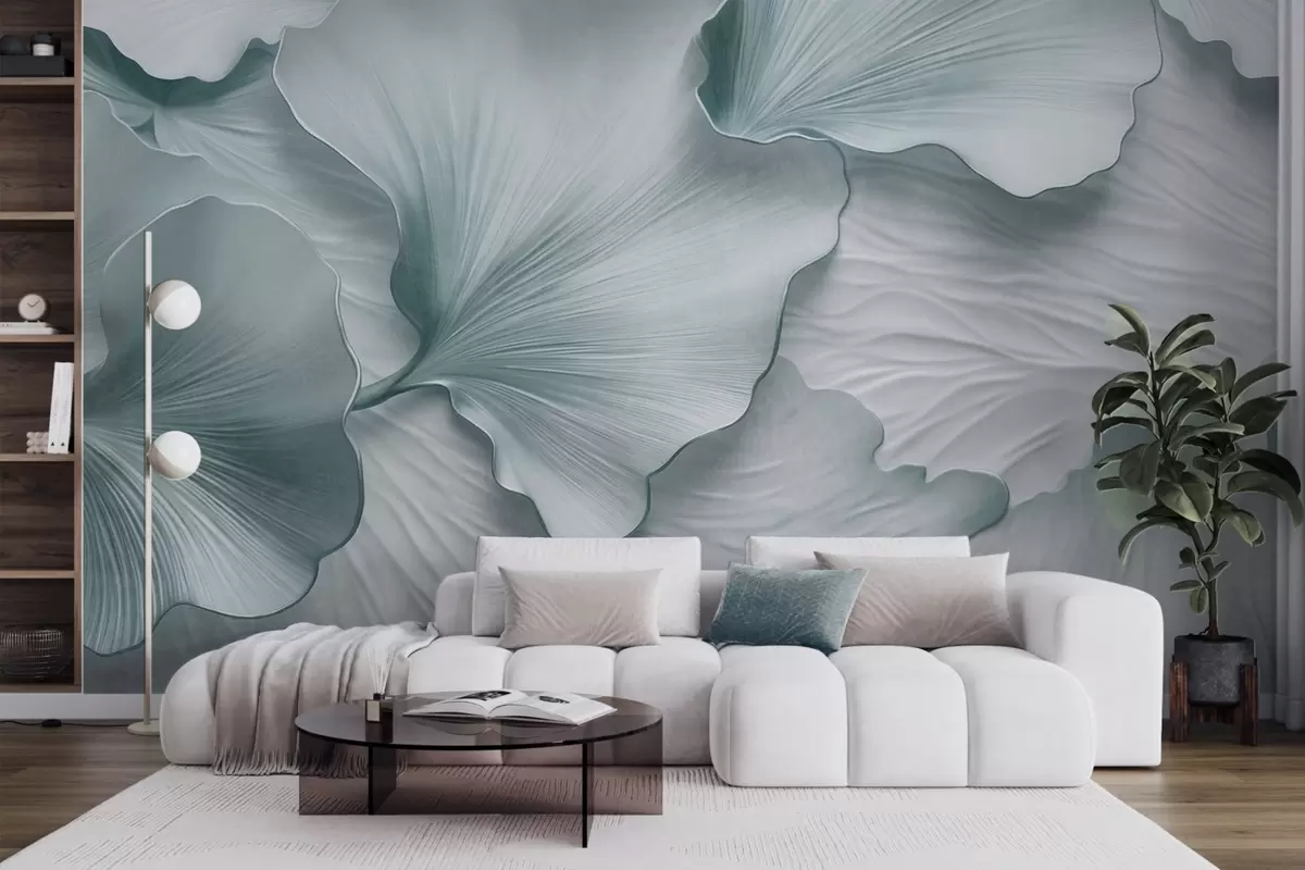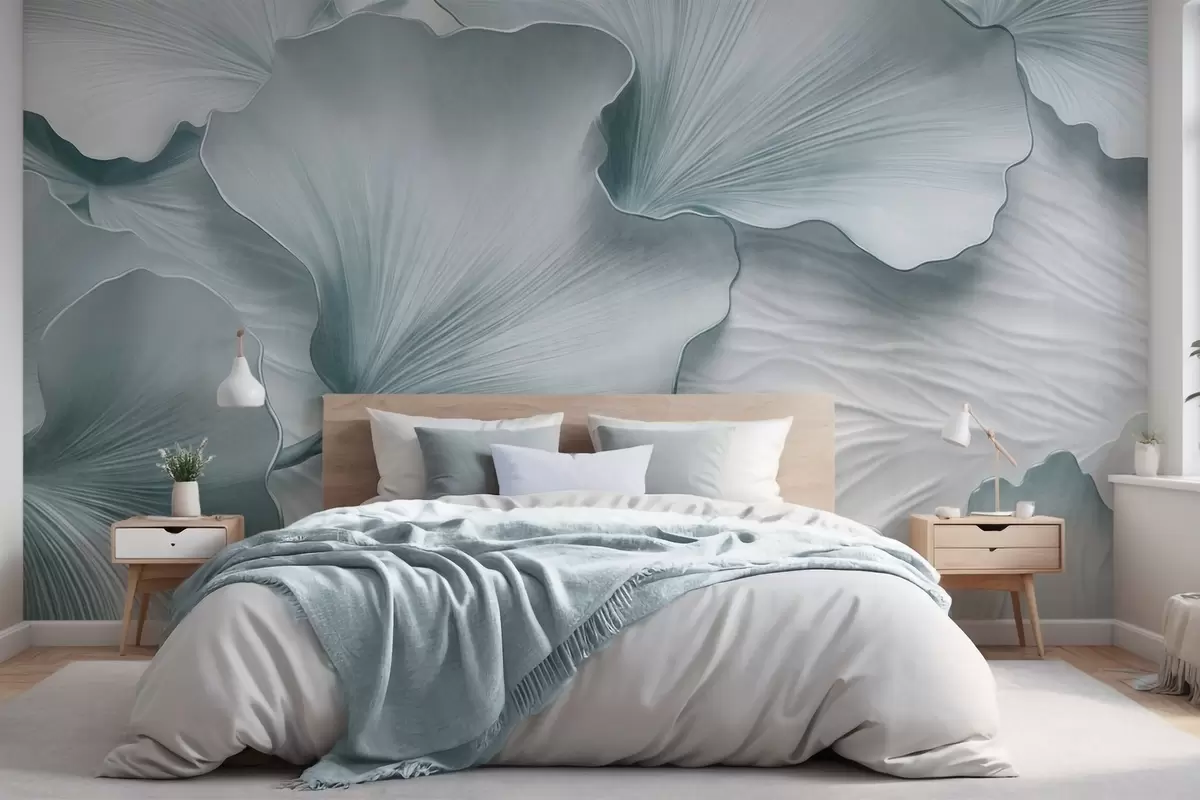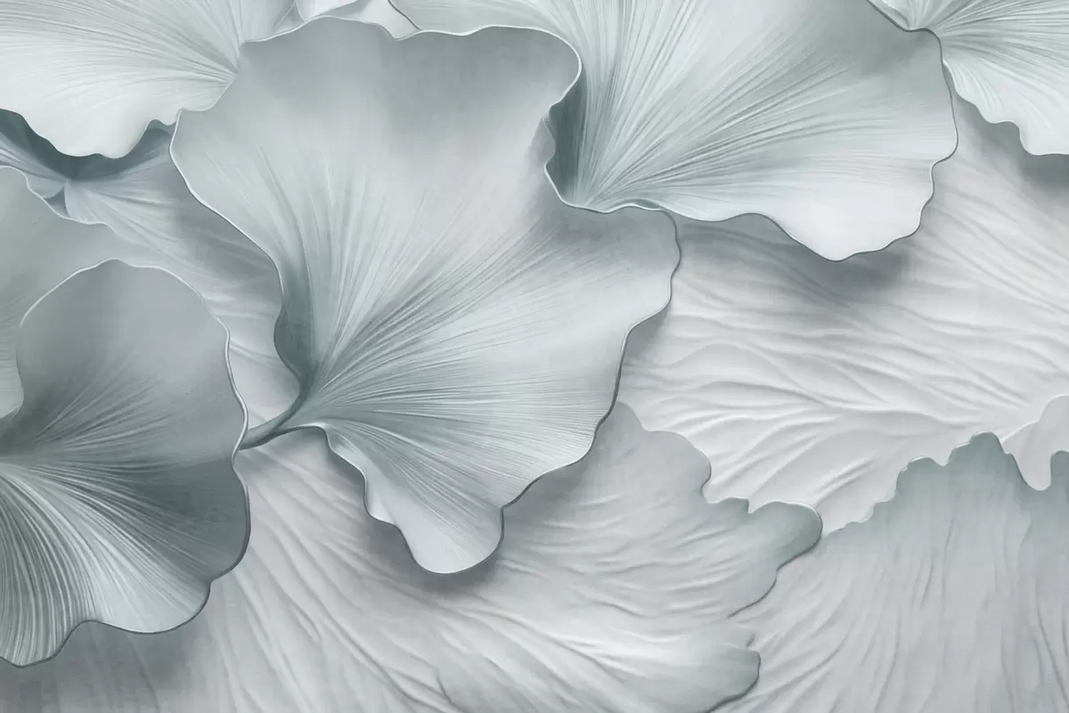Fototapetai Tekstūruoti, mėlyni ir balti ginkgo lapų žiedlapiai su subtiliais organiniais raštais Nr. w09741v1