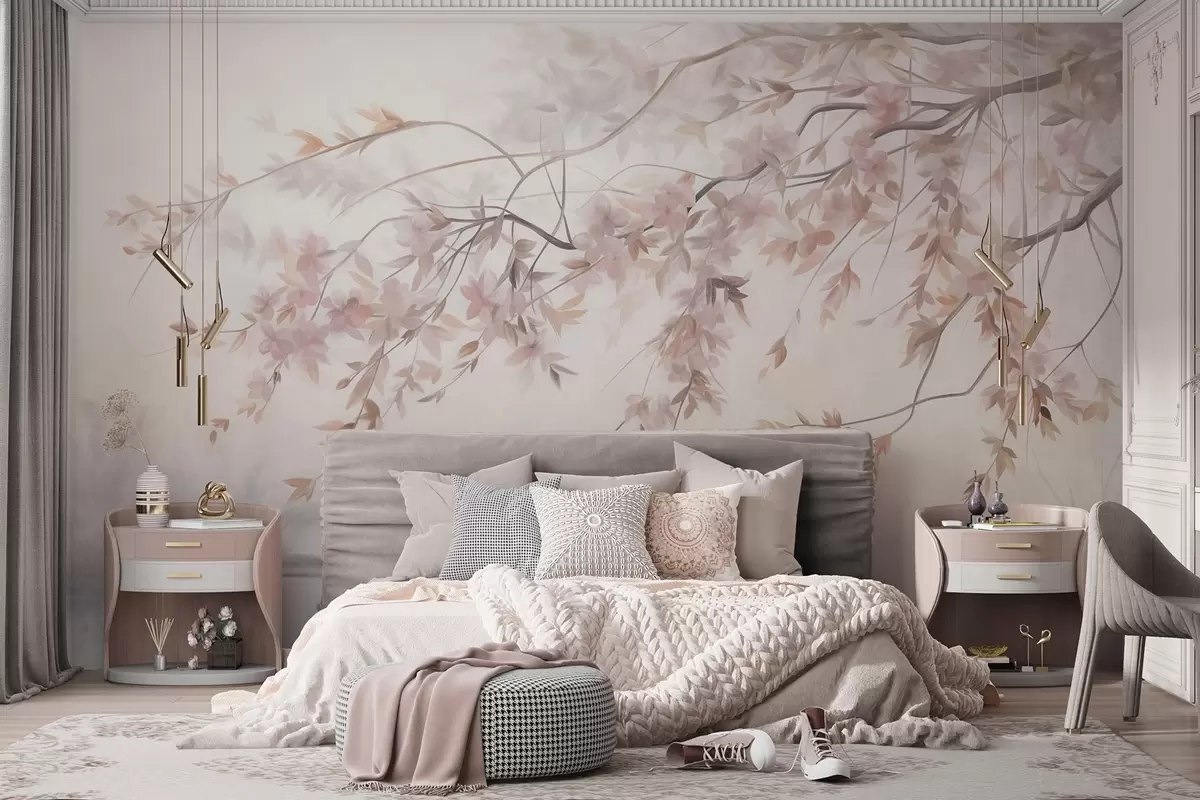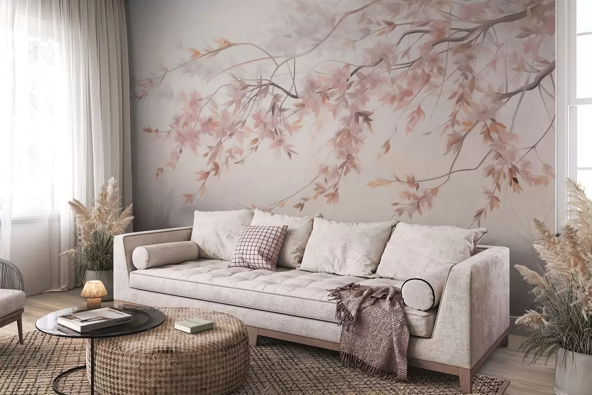 Fototapetai Tekstūruotas peizažas su sakurų šakomis, rožiniais lapais, švelniu, rūkuotu fonu Nr. w09743