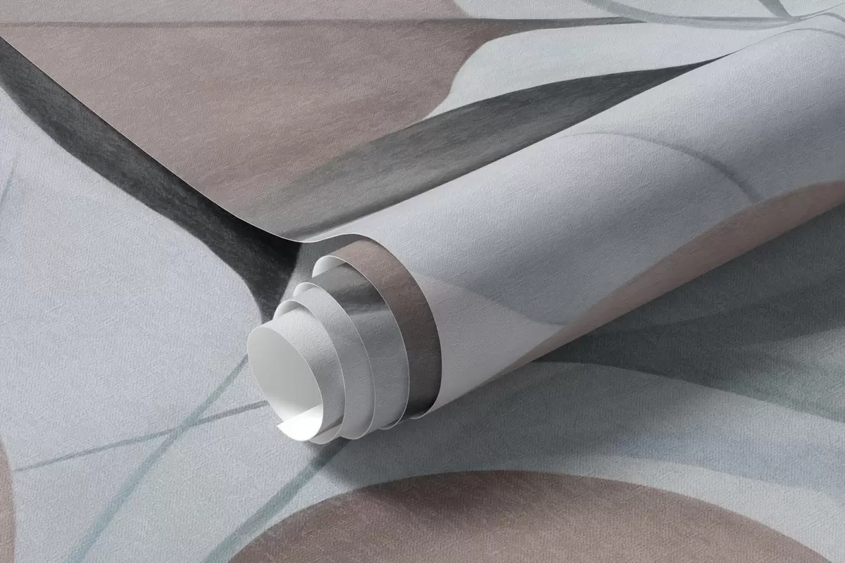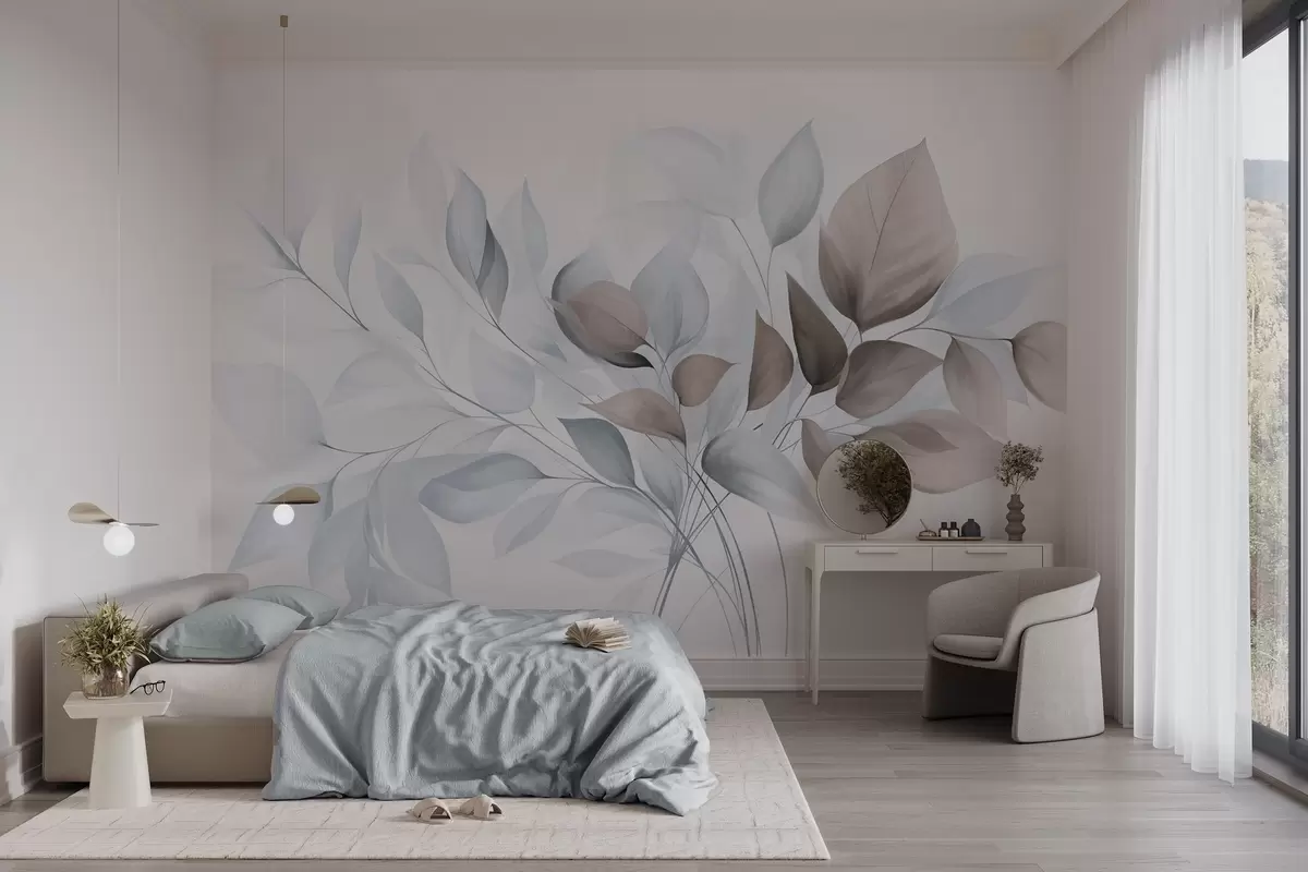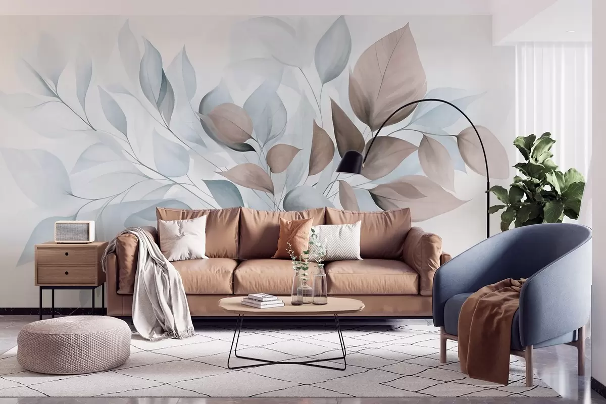 Fototapetai Abstrakčios permatomos lapų formos kompozicijos mėlynos, smėlio ir rudos spalvų atspalviais, tekstūruotos meno kūriniai Nr. w09744v1