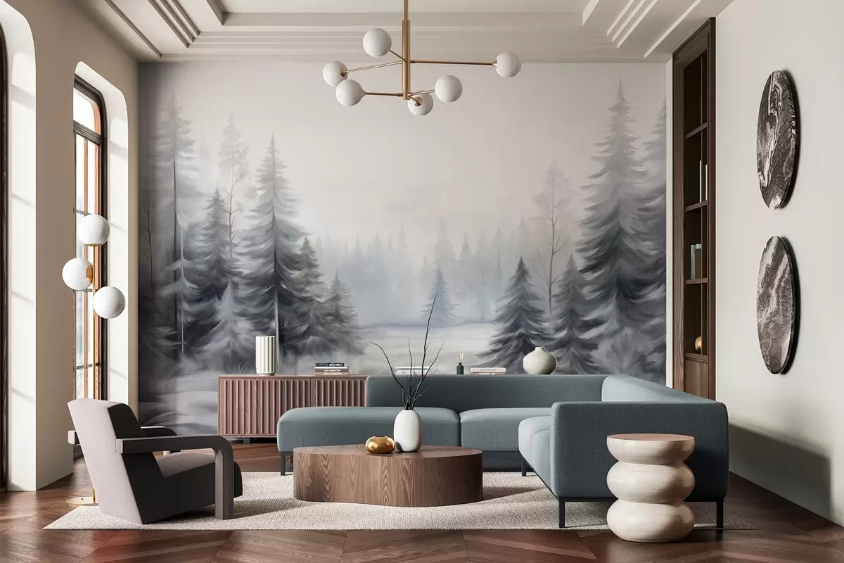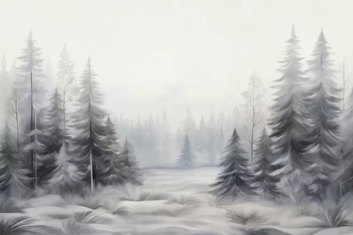 Fototapetai Tekstūruoti žiemos miško medžiai rūke, prislopintų pilkų ir baltų atspalvių Nr. w09745