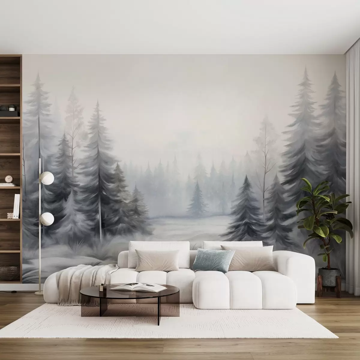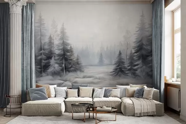 Fototapetai Tekstūruoti žiemos miško medžiai rūke, prislopintų pilkų ir baltų atspalvių Nr. w09745