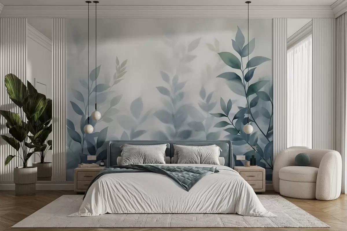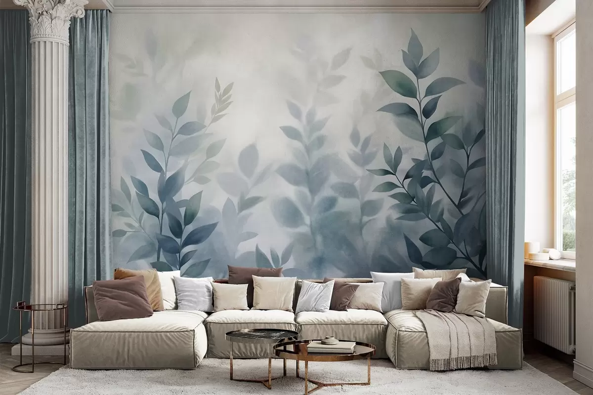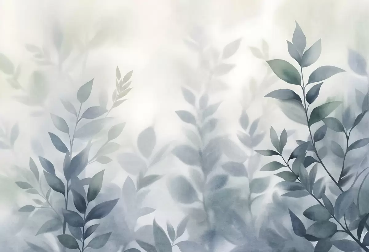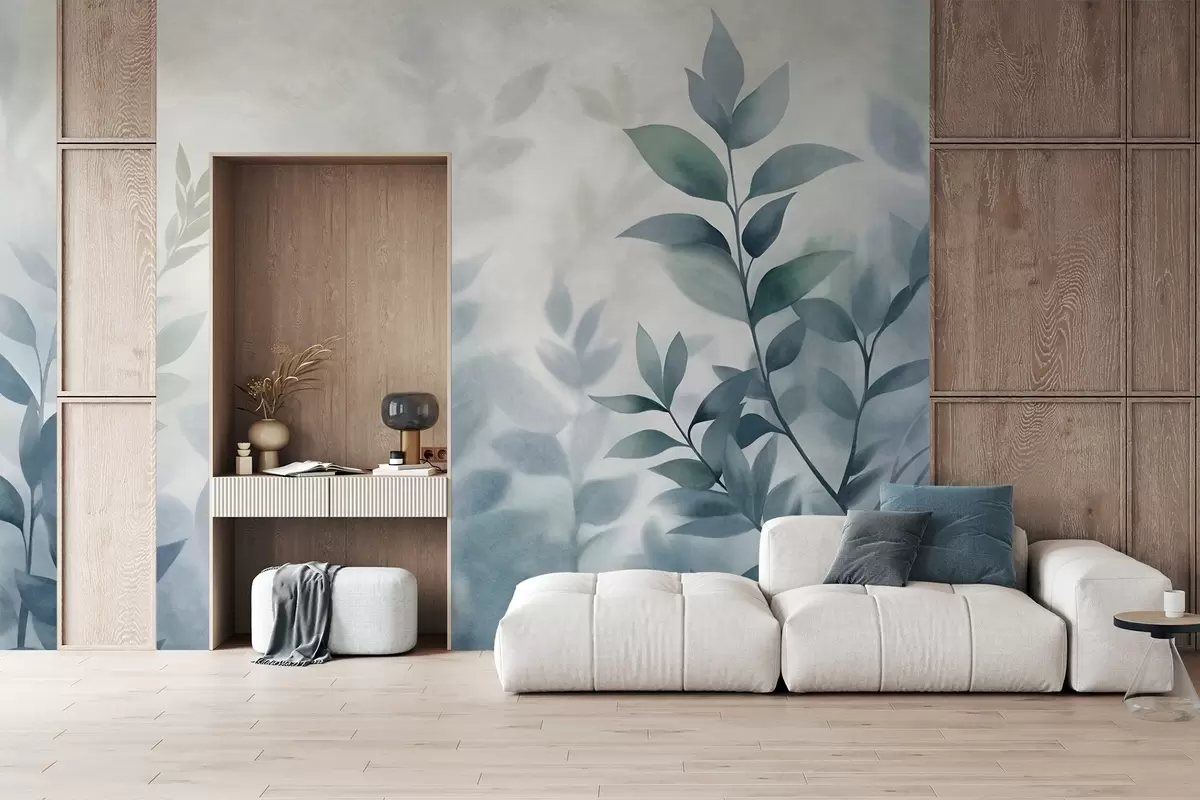 Fototapetai Subtilūs šakeliukai su prislopintais mėlynais lapais, akvarelės stiliaus tapyba, tekstūruotas menas Nr. w09750v1