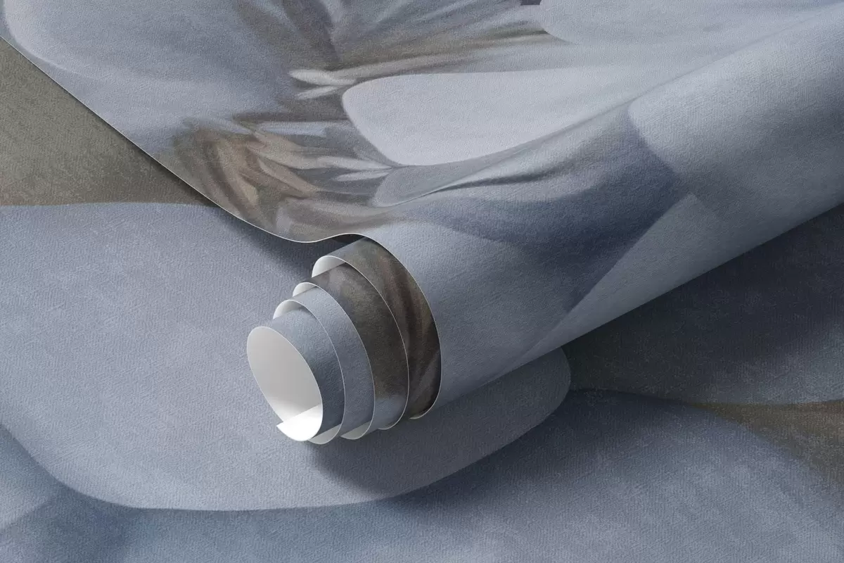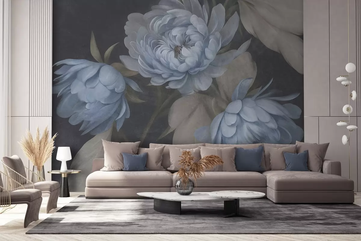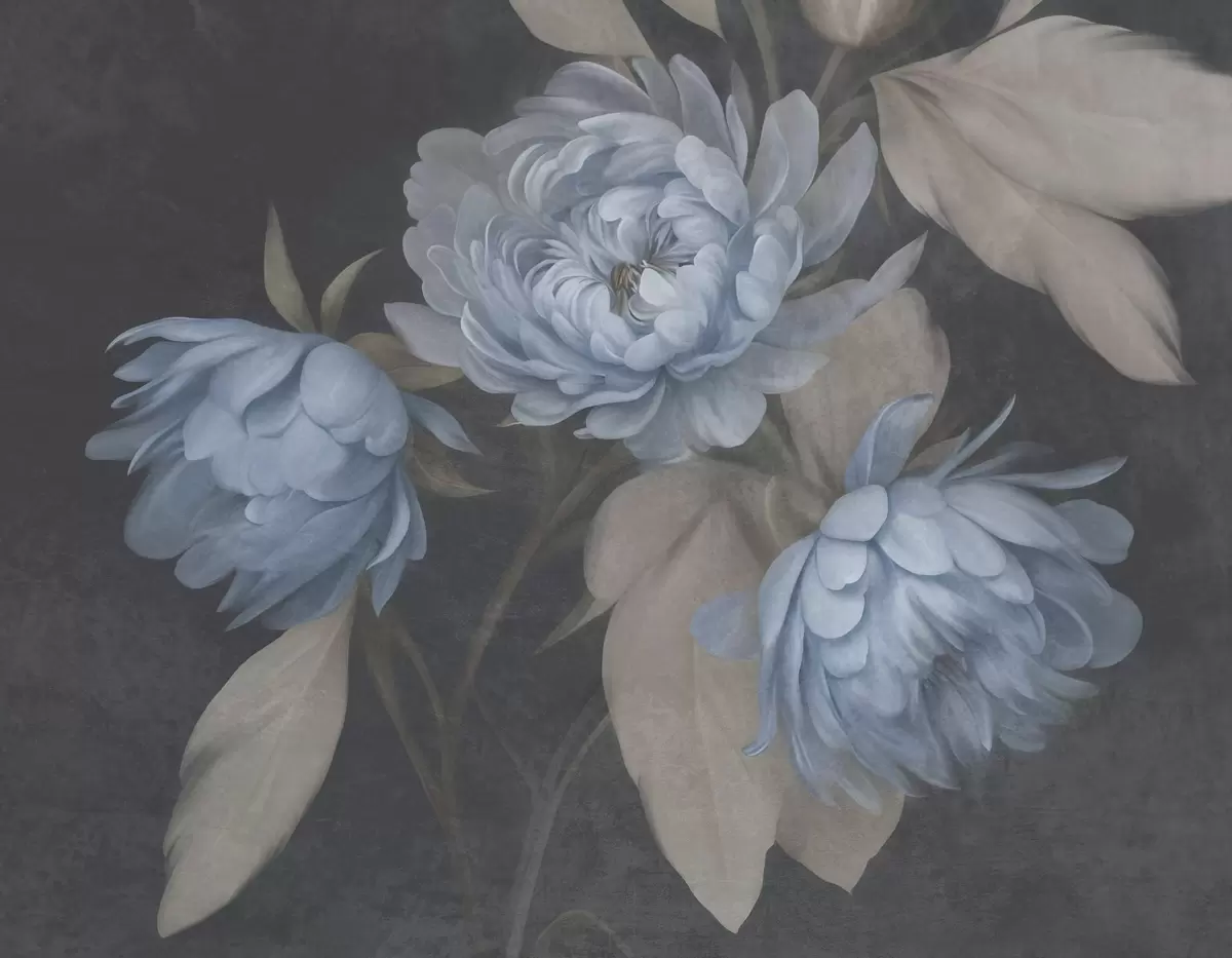 Fototapetai Tekstūruotos šviesiai mėlynos bijūnų gėlės su smėlio spalvos lapais tamsaus fono fone Nr. w09751