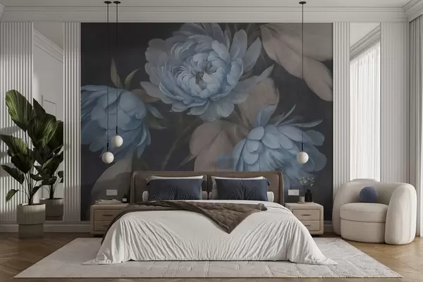 Fototapetai Tekstūruotos šviesiai mėlynos bijūnų gėlės su smėlio spalvos lapais tamsaus fono fone Nr. w09751