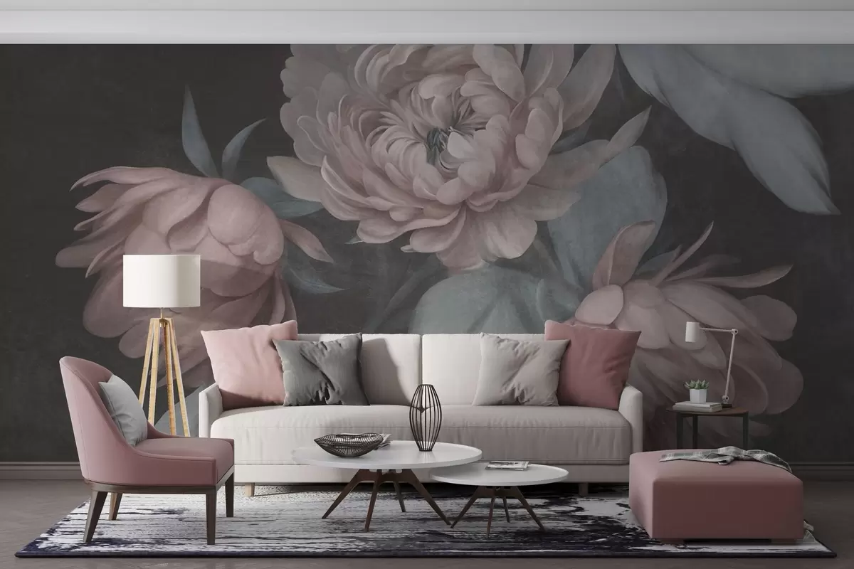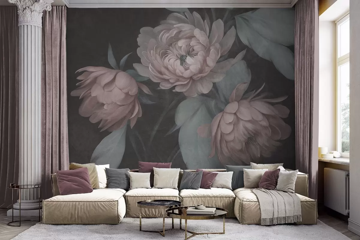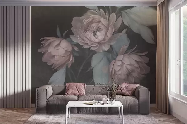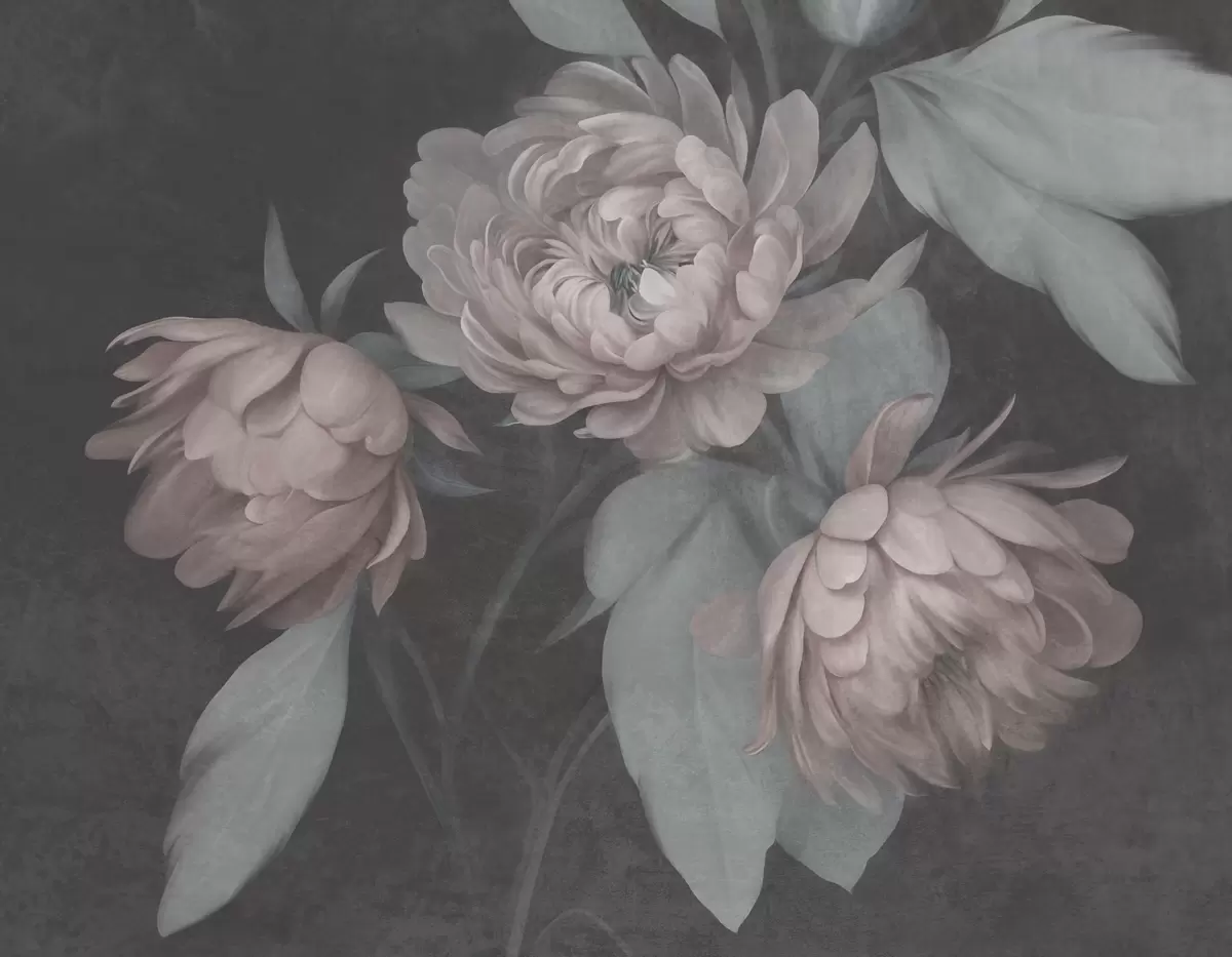 Fototapetai Tekstūruoti šviesiai rožiniai bijūnų žiedai su prislopintai žaliais lapais tamsaus fono fone Nr. w09751v1