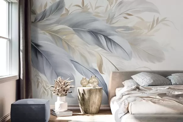 Fototapetai Tekstūruotos pastelinės spalvos plunksnos ir trapūs lapai šviesaus fono fone Nr. w09763
