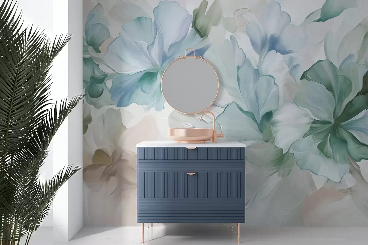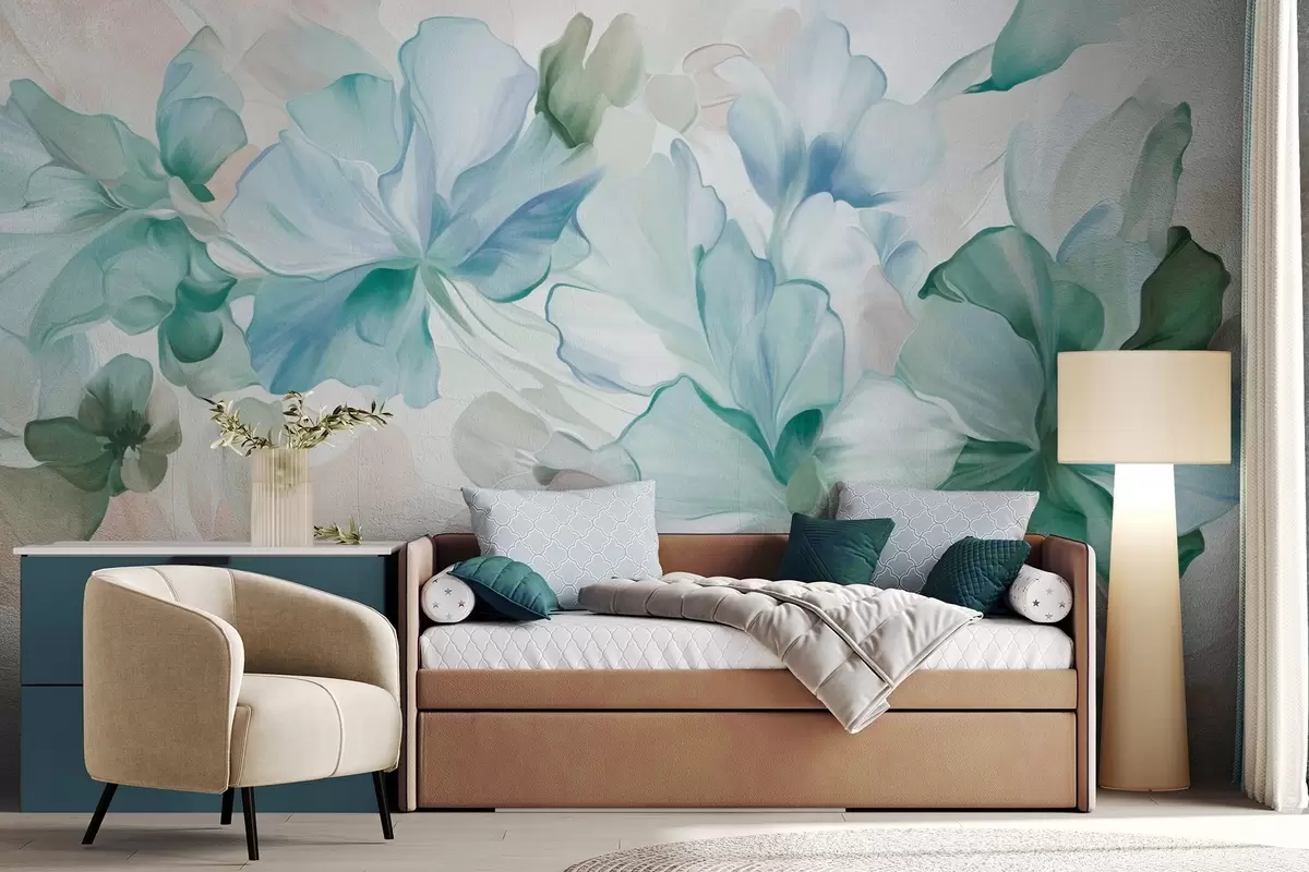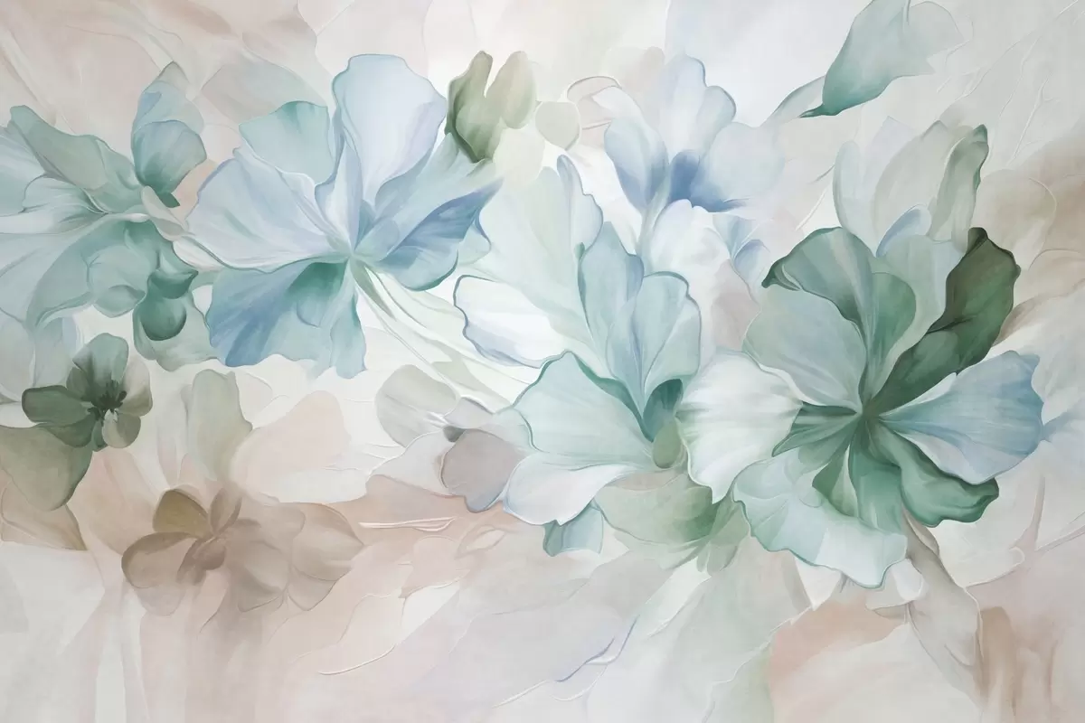Fototapetai Abstrakčios fantazijos gėlės žalios, mėlynos ir smėlio spalvų atspalviais, tapybos stiliaus, tekstūrinis menas Nr. w09767v1
