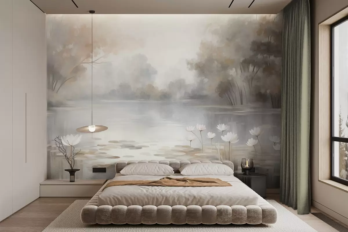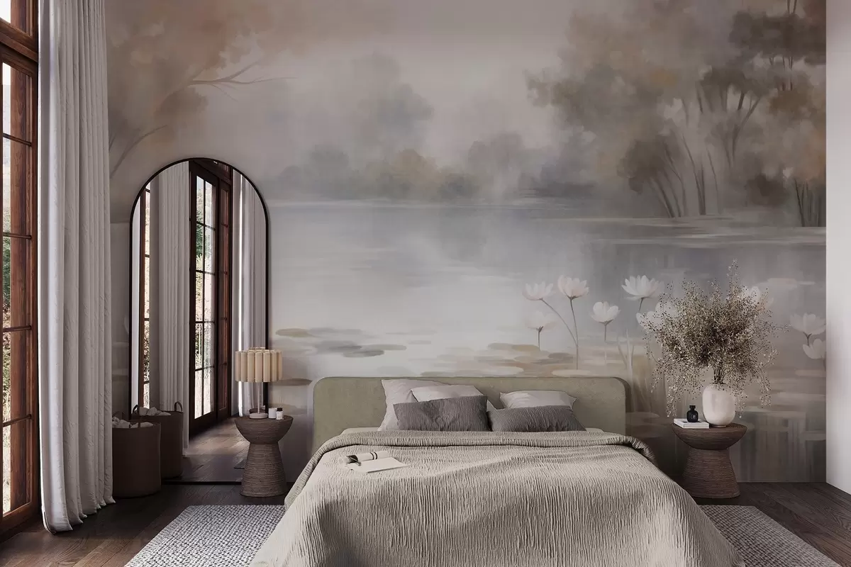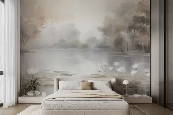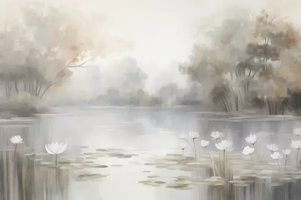 Fototapetai Reljefinis kraštovaizdis, ežeras su baltomis vandens lelijomis, apsuptas medžių, kurių spalvos yra prislopintos Nr. w09768