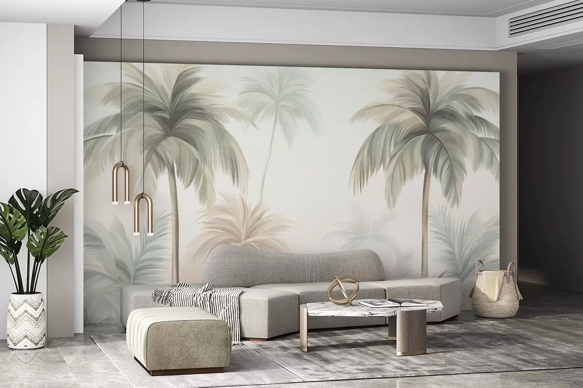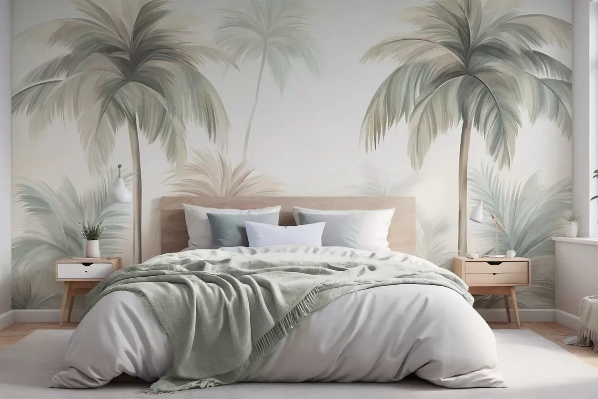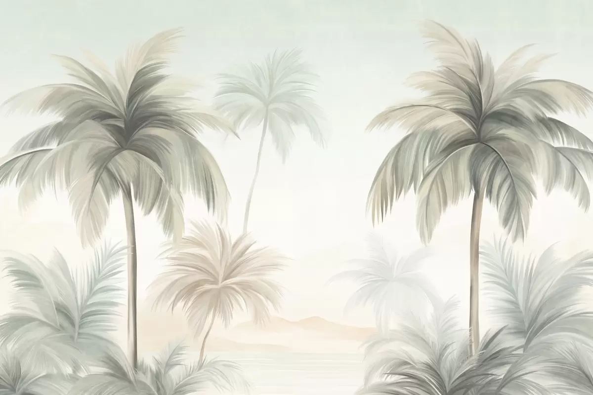 Fototapetai Palmių tekstūros medžiai su prislopintos žalios ir smėlio spalvos lapais prieš švelnų dangų Nr. w09770