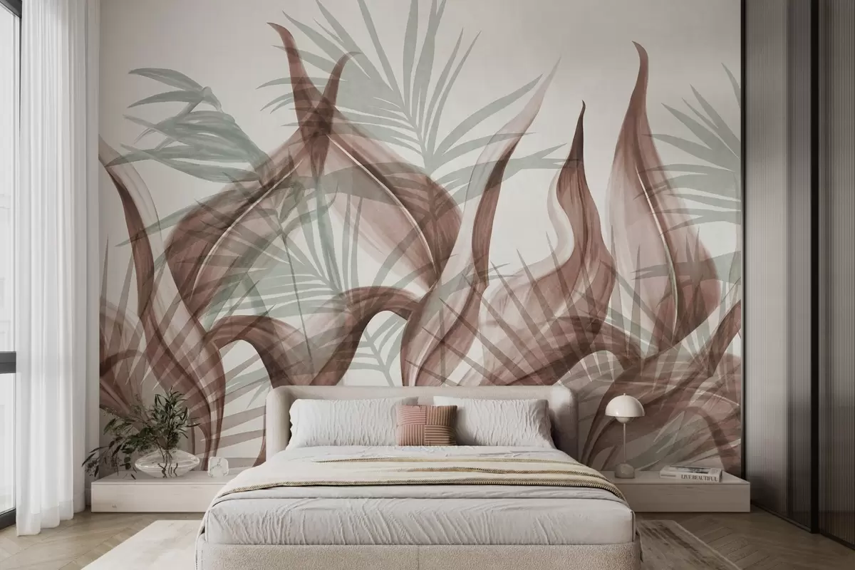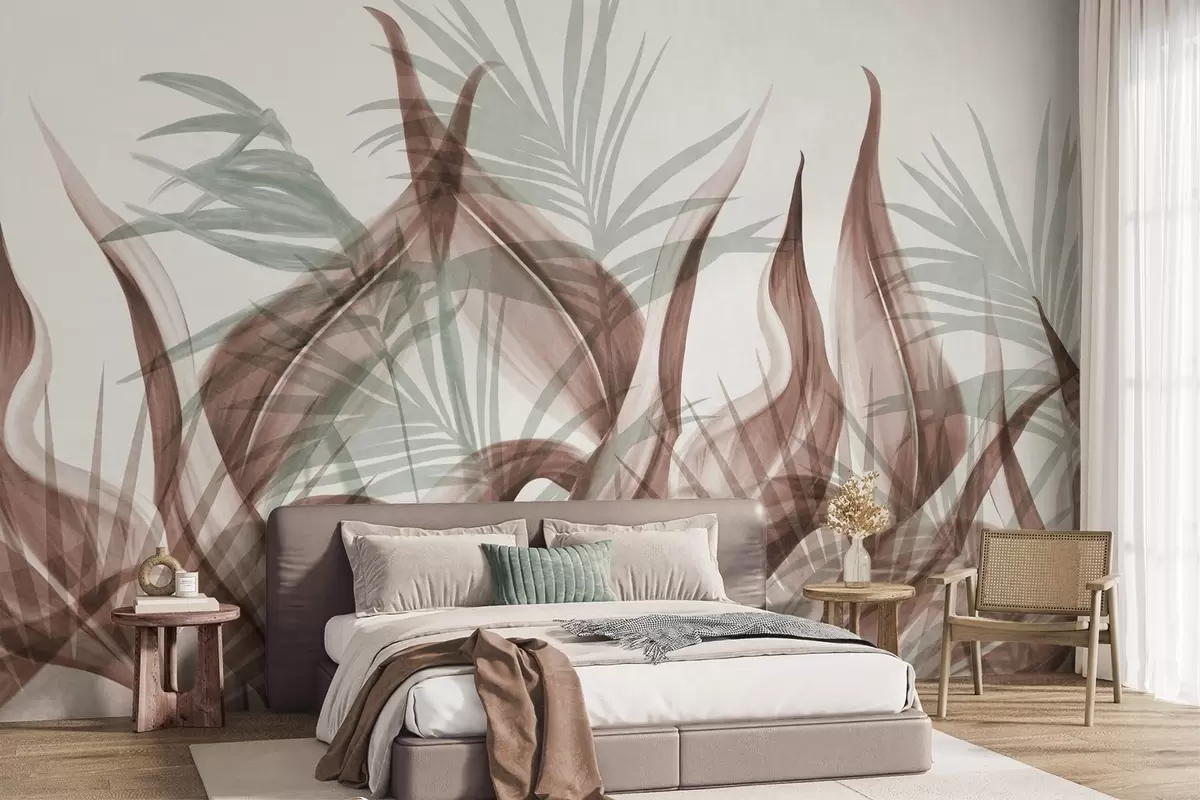 Fototapetai Tropiniai lapai rudų ir žalių atspalvių ant balto fono, tekstūruotas akvarelės stilius Nr. w09772